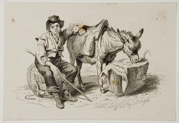 Curator: This delightful artwork is "A Boy on a Donkey," painted in 1855 by Fyodor Bronnikov. Editor: It’s striking, isn’t it? The painting gives off a sense of serene, almost laborious, stillness. The textures seem really pronounced; the roughness of the donkey's coat, the weight of that wooden bucket strapped to his back. Curator: Bronnikov, despite not being a household name today, played a crucial role in the Russian academic art scene. His genre paintings, often depicting everyday life, tapped into a growing social realism that was becoming popular. Consider the context, where art was transitioning from strictly religious and historical themes toward images of contemporary life, offering a perspective that valued the common person. Editor: That emphasis on the "common person" comes through powerfully in the way the painting showcases the connection between child labor and agriculture. Notice the bucket and worn rope, likely implying the boy's work to collect water. And the visible brushstrokes almost elevate the toil into something poetic, or at least visible, refusing to hide the raw materiality behind idealized forms. Curator: Indeed. The romantic style employed also subtly infuses the mundane with a hint of charm, somewhat masking the potential hardship, of the scene, and perhaps appealing to an emerging middle-class market eager for representations of rural innocence. It speaks volumes about the market forces at play even then and how genre painting provided commentary— sometimes idealized and sometimes critical. Editor: And even that hat feels meaningful—like it was repurposed from somewhere else. Not a romantic touch, necessarily, but it reminds us that the subjects used material to its maximum potential, altering it. It also suggests an off-screen parent or guardian working out of shot. All this talk of labor of the scene has now captured my interest as the focus, instead of being a casual painting of rustic childhood it seems. Curator: Precisely, and through such paintings we glean insight into the socio-political currents shaping art's direction in that era. Bronnikov’s piece is now less a standalone image and more an artifact shaped by cultural hands, political pressure, and available technologies that affected not just creation but viewership of art. Editor: Looking closer now, I'm starting to think the whole meaning might stem from this relationship between work and nature! What I mean by this is that our labor shapes even so-called natural experiences. It feels deeply ecological in that way and really moves us beyond assumptions on historical narrative to broader implications now for culture-environment relations today! Curator: Absolutely, and I hope that our discussion has encouraged deeper thinking on how social themes from the past impact, and have shaped the present. Editor: Likewise! It also helped me better notice how humble the painting seems through subject and material means.