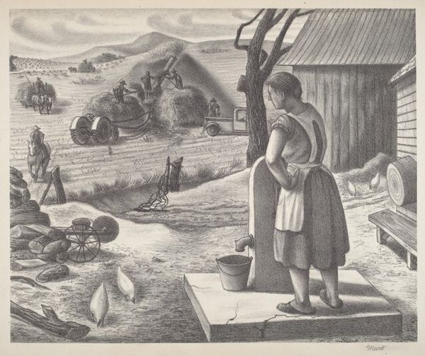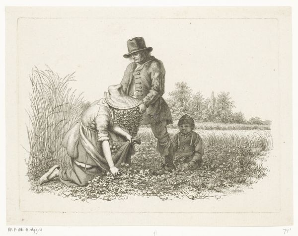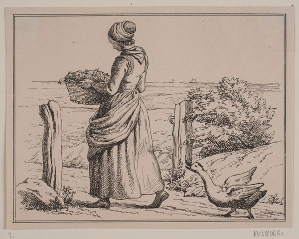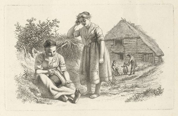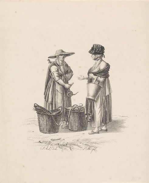 This print, "Two Milkmaids," by Jacob Ernst Marcus, likely created in April 1812, presents a pastoral scene rendered with delicate precision. Notice the two women, yoked and burdened by the tools of their trade, contrasted against a rural backdrop. The etched lines define not only form but also texture, from the rough-hewn wood of the yoke to the soft folds of the women's garments. The composition establishes a clear foreground and background, yet the figures are integrated into their environment. The use of line and the almost ethereal quality of the etching suggest a semiotic reading of labor and landscape. It is an almost romantic vision that could challenge fixed notions of rural life by imbuing it with an aesthetic and classical quality. Note the artist's attention to detail. This elevates the ordinary to the extraordinary, reflecting a broader cultural interest in idealizing the natural world. It encourages us to consider the complexities of representation and the ways in which art shapes our understanding of labour.