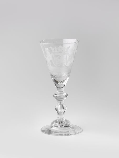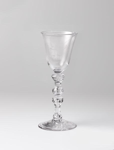 Editor: Here we have a wine glass from around 1760 to 1780, currently attributed to an anonymous artist. The material is primarily glass, with some metal components in the stem. It strikes me as incredibly ornate for something that is essentially utilitarian. What are your thoughts about it? Curator: The opulence is certainly noteworthy. I'm drawn to the division of labor inherent in its creation. The glassblower, the metalworker—they likely belonged to different guilds, representing specialized craft traditions. Who mined the raw materials? Who traded them? These networks fueled the Rococo style. Editor: It’s interesting that you bring up those types of questions about production. Can we really determine much about labour based solely on the art object itself? Curator: I think so. Notice the facets cut into the stem. Each one is evidence of a skilled hand manipulating the material. And those metal accents – how were they joined to the glass? Examining the methods, the making process, opens up questions of who profited, who toiled, and how materials shaped aesthetic values. Think of the guilds and how those traditions reflect the economic landscape of the time. The elaborate design probably speaks volumes about the inequalities in society at the time. Editor: I hadn't considered how deeply the supply chain could affect something as simple as a wine glass. The relationship of the raw materials used to production to this aesthetic we see here! Curator: Exactly. The glass speaks, if you consider the context of its making. We might learn something from looking closer. Editor: Definitely a new way to appreciate art and social inequality.