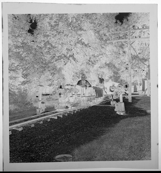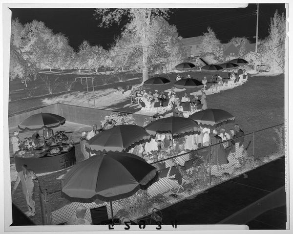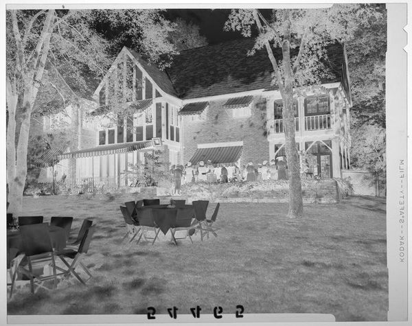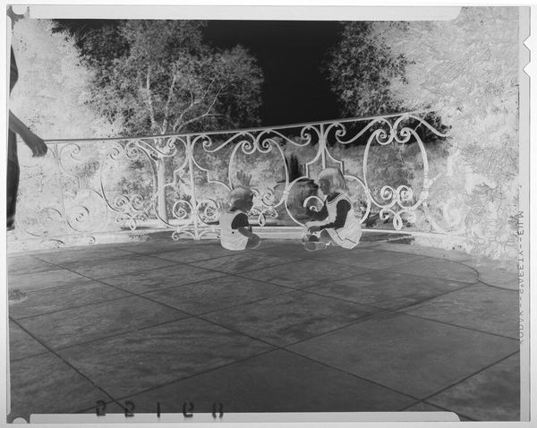 Curator: This is an Untitled photograph by Lucian and Mary Brown, housed at the Harvard Art Museums, depicting a large patio overlooking a lake. It's a small piece, just about 4 by 5 inches. Editor: The high contrast gives it an eerie, almost dreamlike quality. The stark division between light and shadow flattens the scene. Curator: I'm struck by how the composition highlights the constructed environment—the meticulously laid stone patio, the arrangement of furniture—contrasting with the implied leisure and surrounding nature. How do the Browns frame our understanding of domestic space? Editor: This space speaks to a particular privilege. Who had access to such leisure and how was that maintained? Consider the labor involved in constructing and maintaining this idyllic scene, likely unseen and unacknowledged. Curator: Absolutely. The photographic process itself is relevant too. What choices did they make in terms of materials and printing? Was this a common scene? Editor: It invites us to question the narratives of comfort and aspiration embedded within it. Curator: Indeed, a space seemingly designed for rest opens up questions of power, access, and labor. Editor: It’s more complex than a simple snapshot of domestic bliss.