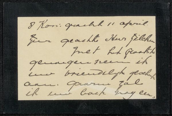 Curator: Looking at this fragile slip of paper, one gets a sense of immense intimacy. It is entitled “Visitekaartje aan Henriette Wilhelmina van Baak” by Hélène Gombert, made between 1867 and 1930. It's ink on paper, and what strikes me is the sheer ephemerality of it all. Editor: Oh, it's absolutely dreamy! Like finding a bottled message tossed from another time. The handwriting floats like mist, and you just know it holds secrets. Curator: The artistry resides not only in its creation but also in its survival. We see here the remnants of formal correspondence rendered almost abstract by the delicate fading of the ink. It is less about content, and more about form. Observe the rhythm of the lines. Editor: Yes, the form! It’s got this wonderful raw, unvarnished quality, hasn’t it? The torn edge adds a pinch of rebellion to the otherwise polite sentiment. I feel like it's murmuring untold stories of hidden crushes and forbidden adventures. Curator: Precisely. Notice also the strategic use of the void. Gombert understood how much weight the blank space carries—accentuating the calligraphic elements. Its very incompleteness suggests more than any meticulously finished drawing could. Semiotics suggests that it embodies a certain absent-presence. Editor: Mmm, absent-presence... I'll need to remember that! It has such melancholy vibe. Almost makes you want to reply and find out more. But of course, we are unable to now. Such an artistic intervention. Curator: An astute observation. I believe we have both uncovered intriguing facets of this quiet artwork today. Editor: Agreed. A treasure pulled from the folds of yesterday that echoes in the halls of now. Beautiful.