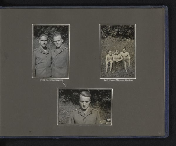 Curator: This gelatin-silver print, taken sometime between 1941 and 1945, features Rheinhold Mohr with a friend. It's presented in what appears to be a family photo album. The photograph shows us the aesthetic conventions of that time, but also suggests more hidden stories. Editor: My immediate impression is that it speaks to themes of companionship and the realities of life during wartime. I’m struck by how carefully these images are placed in this album. Their layout, with these bordering white frames, resembles cinematic filmstrip stills. The photographer composes moments that invite closer viewing, a deliberate curation. Curator: The uniformity of dress, the sailor outfits, places them within a clear historical context, likely naval cadets. What I find compelling are the variations in how they pose across the three photos—formal, candid, helpful. Each captures a subtle shift in their dynamic, but each shows their brotherhood. Editor: Right. This is not merely a portrait but an intimate staging of social bonds. Look at the contrast. The central photograph aligns them frontally; their faces almost merge into one. They appear as comrades, inseparable perhaps by circumstance as much as affection. The image to the right shows what might be construed as tension between the sitters with closed-off posturing, which adds some realism. I like the dynamic play of light across the tonal range. Curator: Do you see a story of connection, of brotherhood tested and strengthened? The act of physically arranging them within the album is itself powerful. What might have prompted someone to preserve these particular images and that organization? It begs questions. Editor: I agree. Even if anonymous, each one embodies a frozen frame of memory. The photographer here—if someone other than themselves—demonstrates not only compositional expertise but perhaps an emotional understanding of the scene's meaning and that, of course, would translate to an audience looking at the prints decades later. Curator: A lasting artifact then. More than the composition, I am deeply moved by how the album and its layout create a narrative of those bonds during those specific wartime moments. It transcends just the photographic document. Editor: Yes, it goes beyond aesthetic assessment to what the images hold as personal record and artifact. It tells more than we will know, but offers enough that we keep questioning their moment and our moment today.
