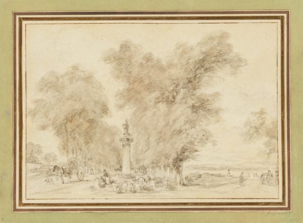 Editor: We're looking at "Landscape with Shepherds" by Francesco Zuccarelli, created around the mid-18th century using watercolor. The sepia tones give it a wistful, almost dreamlike quality. What strikes you most when you look at it? Curator: The groupings of figures—shepherds and their flock—nestled within this idealized landscape certainly evoke pastoral traditions, but I'm particularly drawn to the subtle ways Zuccarelli uses light and shadow. Do you notice how the figures are positioned relative to each other, almost like a stage tableau? Editor: Yes, there's a formality to their arrangement, even though it’s a scene of everyday life. The trees seem to frame them, drawing my eye. Is there a narrative here? Curator: Perhaps not a specific narrative, but definitely an atmosphere. Think about the symbolic weight of the shepherd figure throughout art history – often associated with guidance, protection, and a simpler, perhaps idealized way of life. Zuccarelli taps into that visual language, presenting a carefully constructed world that speaks to ideas of harmony and order. How do the natural forms influence how you feel? Editor: I hadn't considered the historical significance of shepherds that deeply. The way nature almost cradles the figures adds a sense of tranquility. Curator: Exactly! It makes you consider the symbolic significance embedded in seemingly simple imagery, echoing through time. Editor: It's fascinating to see how much cultural meaning can be packed into a single scene. I'll definitely look at landscapes differently from now on. Curator: And I'll be pondering the enduring appeal of pastoral imagery, how it reflects our longing for simpler times.