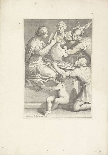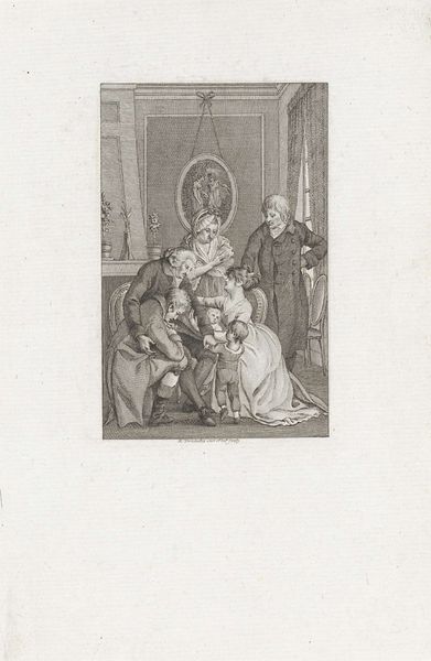 Editor: Here we have Reinier Vinkeles’ engraving, “Jozef maakt zich bekend aan zijn broers,” from 1797. It's housed right here at the Rijksmuseum. The scene feels very dramatic. I see this central, dominant figure, and the men surrounding him seem overwhelmed. How do you interpret this work? Curator: The drama you observe stems from its Neoclassical style, which often depicted heightened emotional states, drawing on historical and often Biblical narratives. Considering Vinkeles was working in the late 18th century, during a time of massive social upheaval, how might the themes in this image—identity, family, and power—relate to the anxieties of the artist's contemporary world? What do you notice in the image that speaks to such questions? Editor: I notice how everyone seems to be reaching for this one central figure. They’re on different levels, some kneeling, others more upright. Could it represent different positions within a social hierarchy, and the potential disruption of that hierarchy? Curator: Exactly! And how does Vinkeles utilize the conventions of Neoclassical art to potentially comment on colonial power? Look at the setting. Note the figures and the backdrop of what seems like Egypt in the background. Editor: It’s interesting that you bring up colonialism. I hadn’t really thought about that. Is that something we often see reflected in art from this time period? Curator: Often, yes. Artists frequently used historical or biblical narratives to explore or justify contemporary social structures. Thinking about this image through that lens really transforms it for me. Editor: I see what you mean. It makes me consider how even seemingly historical depictions can be so deeply connected to contemporary politics and power dynamics. Thanks!