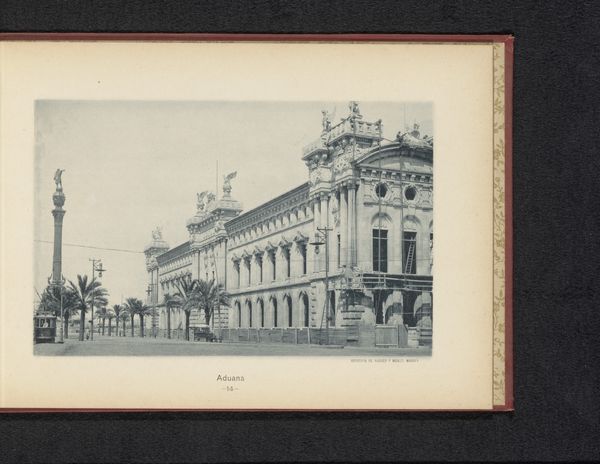 Curator: What a strikingly formal image! Before us we have “Gezicht op een jezuïetencollege in Barcelona,” which translates to “View of a Jesuit College in Barcelona,” taken sometime before 1890. It's an albumen print, credited to Hauser y Menet. What are your initial thoughts? Editor: Stark and precise. The receding lines of the architecture really draw your eye. The high contrast gives it an almost graphic quality despite the realistic details, with the lines of the building cutting across the softened form of the tree. Curator: The image encapsulates the late 19th century’s interest in documenting urban spaces and civic structures. Photography was booming and was harnessed as a tool for creating visual records of a rapidly transforming Barcelona. The Jesuit College held significant influence during that time and representing its grandeur through the then-novel medium of photography speaks volumes about its prominence. Editor: Definitely. Look at how the composition emphasizes verticality— the long facade, rows of windows, and even the lone tree beside the building, it all underscores the building’s commanding presence. The muted tones also lend a kind of solemnity to the place. Curator: I think this building embodies an era defined by increasing secularization in Spain. Despite this transformation, religious institutions still held great power and visibility within society. These kinds of photographs offered ways to reflect on that dynamic tension within the urban fabric. Editor: I'm also struck by the balance here. The positioning of the figures, although small, provides scale, and it cleverly pulls your gaze into the frame—the overall design seems carefully constructed to present a scene of dignified, stately composure. Curator: Indeed, that staged sense is a hallmark of many architectural photos of this period. They were rarely objective records, and frequently intended to present the building as an aspirational symbol for society. Editor: So, beyond being a visual document, this work then reflects on those very societal values through form, line, and calculated balance. Curator: Precisely! By analyzing the interplay between space, representation and societal structures, we start understanding the deeper implications this photograph presents.
