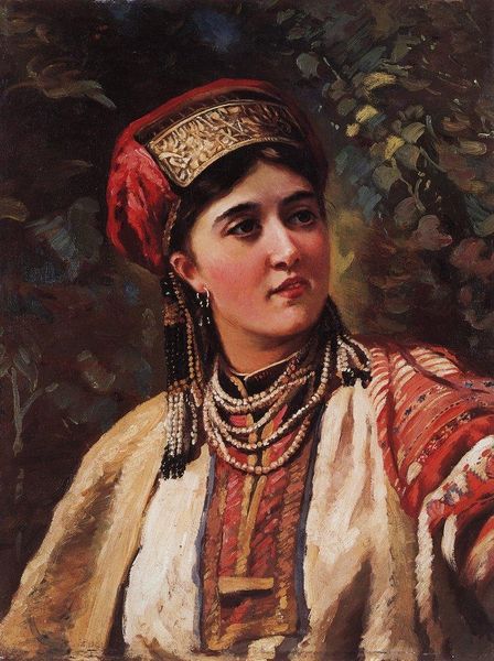 Editor: This is "Scheherazade," an oil painting by Sophie Gengembre Anderson. There's something so compelling about her gaze; it’s both vulnerable and knowing. What stories do you think Anderson is trying to tell us here? Curator: This piece offers a fascinating lens through which to examine Orientalism and its impact on the representation of women. Consider the Western gaze through which Scheherazade is presented, adorned in what might be considered exotic attire. How do you think this image contributes to, or perhaps challenges, prevailing notions of the “Orient” and its women during that period? Editor: That's a good question. I guess I hadn't really thought about it that way. The subject’s expression seems more individual than stereotypical. Is it possible Anderson was trying to push against those trends? Curator: Precisely. Anderson, as a female artist herself, may have been subtly critiquing the objectification inherent in Orientalist depictions. Her Scheherazade holds a sprig of olives – a sign of peace and a clever symbol against what could have been a painting furthering the rhetoric that perpetuates damaging stereotypes. Do you notice how her direct gaze resists passive submission? Editor: Yes, I see what you mean. There's strength there, definitely. It’s made me completely rethink my initial reaction to the image. Curator: Exactly. This reminds us that artworks aren't created in a vacuum. Exploring the socio-political context is paramount in interpreting a piece like this and unveiling its layers of meaning and nuance. Editor: It’s definitely given me a new perspective, considering the art-historical background in relation to contemporary understanding. Thank you!