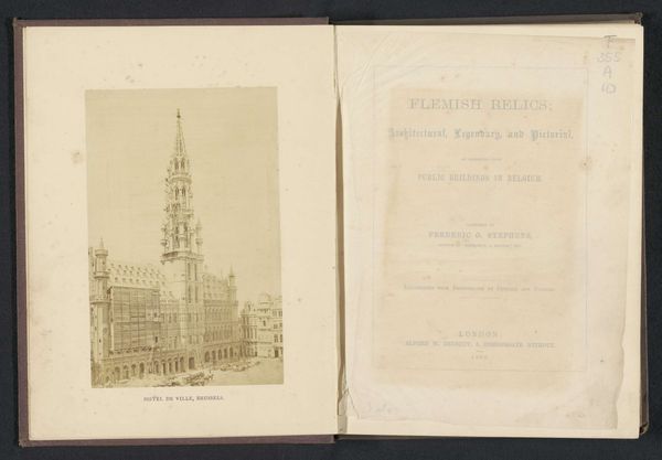 Editor: So, this piece is a photograph of a print, created before 1869, of the Regensburg Cathedral façade by Joh. Laifle. It gives me the sense of uncovering an old architectural document or blueprint. The paper has that beautiful aged quality. What stands out to you most in this piece? Curator: Ah, it whispers tales of time, doesn’t it? I’m immediately drawn to the contrast – the stark precision of the architectural rendering against the soft, almost dreamlike quality of the aged paper. Notice how the rigid structure is softened by the printing technique? It’s almost as if the very stone is breathing, alive with history. There’s a deliberate layering of past and present, don't you think? The formal title page next to the rendering, boasting of Regensburg "in its Past and Present"…It all contributes to that feeling, right? Editor: Definitely! It feels almost romantic in a way, idealizing this cathedral and the history of the town. Curator: Precisely! Consider, too, the inclusion of what looks like a coat-of-arms, or keys perhaps? It hints at deeper civic pride, ownership. This isn’t just a pretty picture, is it? This print whispers of powerful families, traditions… Did you notice the publisher’s details at the bottom of the right page? It places the book and photograph squarely into the industrialization era. Quite thought provoking, isn't it? Editor: It really is. I initially just saw a pretty building, but now I see layers of history, civic identity, and even a hint of industrial progress. Thanks so much for that. Curator: My pleasure! That's the funny thing about art, isn't it? Just when you think you see it all, there’s always another hidden doorway just waiting for a little intellectual nudge.