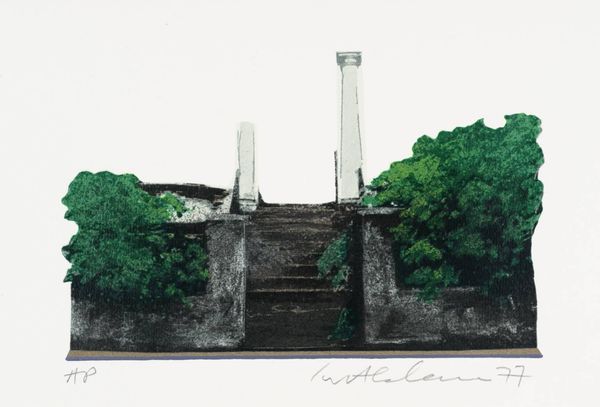 Editor: Here we have Ivor Abrahams' "Oxford Gardens IX." I find it slightly unsettling. It’s both inviting and forbidding, isn’t it? What leaps out at you? Curator: It's definitely got that push-and-pull, doesn't it? I see a slice of manicured suburbia – the clipped hedges, the suggestion of hidden depths. It’s like a stage set. I always wonder, what drama is about to unfold? What do you think the artist intended with this tension? Editor: Maybe it's about the hidden lives behind closed doors? Thank you. I will definitely look at this piece differently now. Curator: Precisely! Perhaps we all crave a bit of mystery, a glimpse behind the curtain. Food for thought, eh?