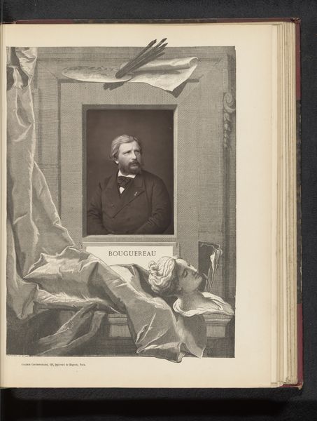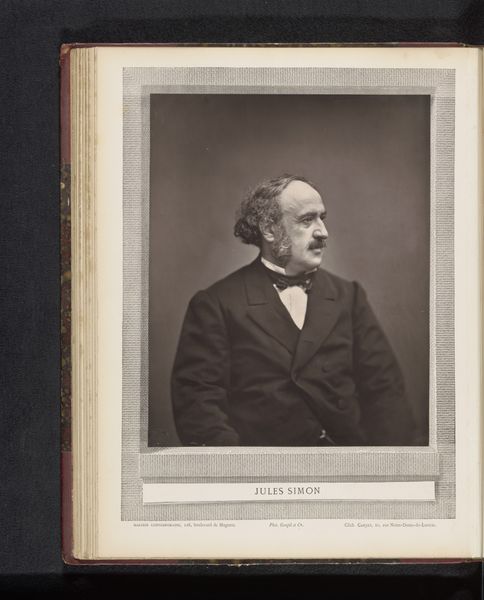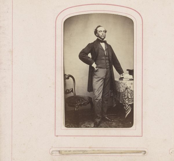Editor: Here we have an albumen print, a photograph of Félicien-César David, taken before 1876 by Bertall et Cie. The way he’s leaning casually against that draped table gives him such a confident, almost theatrical air. What do you make of this portrait? Curator: Notice how the patterned fabric serves as a compositional element but also hints at David’s cultural associations. Composers, and artists generally, often adopted signifiers—bow ties, flowing hair, the affected pose—that marked them as “artistes.” Are these truly individual expressions, or conventions of cultural performance? Editor: That’s fascinating. It feels almost like he’s consciously adopting a role. Curator: Exactly! And photography at this time, particularly portraiture, was carefully constructed. He is pictured amidst suggestion and shadow, rather than revealed by direct light. It suggests the romantic mystique associated with artistic genius. Editor: So, the romantic artist as a subject of both admiration and mystery? Curator: Precisely! The details like his carefully styled hair and elegant vest, paired with that casual lean, construct a very specific image. Think about the legacy of Romanticism at this point: its iconography became established, even expected. What do we, looking at this image today, expect of an artist? How much of that is inherited? Editor: I never thought about it that way, how much these visual cues have shaped our understanding of artists. Curator: The photographic image is a medium of constructed symbolism; an active visual rhetoric that builds our understanding, layer by layer. Editor: Thank you! I'll certainly be considering images in a whole new light.