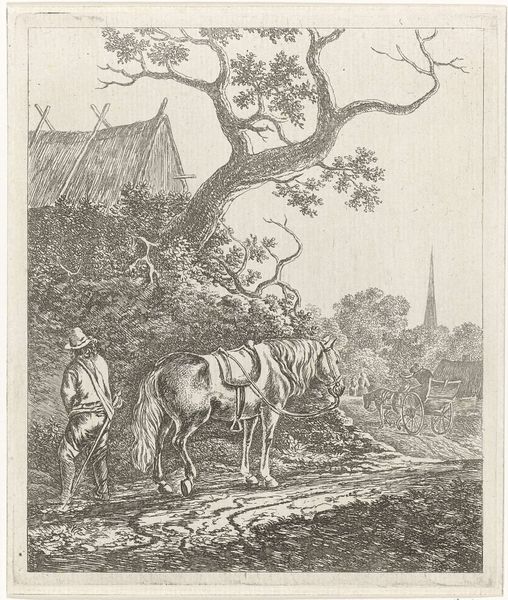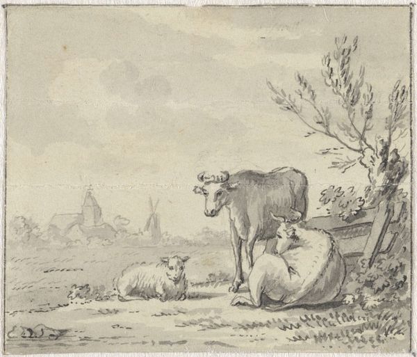 Editor: So, this is "Boer staande bij een hek met vee," a pencil drawing dating somewhere between 1775 and 1833, by Jean Bernard, currently held at the Rijksmuseum. There's a quietness to it that's striking, almost like a stolen moment. What catches your eye in this unassuming, pastoral scene? Curator: It whispers, doesn’t it? To me, it's a portal to another time. Forget the heroic landscapes—this is the gentle pulse of everyday life. I find myself drawn to the farmer's gaze, almost hidden behind the fence. What do you think he’s seeing? Editor: Maybe he's just appreciating the calm? It makes me think about how disconnected we are from that sort of simple, agrarian existence today. It’s romantic, but was life really like that back then? Curator: Ah, the eternal question! Likely more arduous, undoubtedly. Yet, the artist has framed it with a sense of serene dignity. Consider the careful composition: the weighty ox anchors the scene while the flock, huddled together, introduce depth and perspective. There's beauty and even poetry in ordinary work, I find. A window, smudged though it may be. Editor: It is striking, this unidealized view. Something feels genuinely observed. Like he just sketched what was right there. Do you think that realism makes it feel so compelling, even now? Curator: Precisely. He's not selling us grand narratives but offering a fleeting glimpse. Like capturing a firefly in a jar; holding for a moment the ephemeral beauty of rural existence. You start to wonder, is it art reflecting life, or life mirroring art? Editor: That’s really made me think. It’s not just a picture of a farm, it's a piece of captured time. Curator: And perhaps, it captured us too, in a little corner of it.