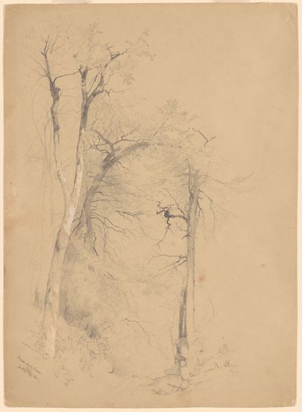 Curator: John Ruskin created this delicate pencil sketch, "Study of Trees from Turner," in 1857. Editor: It’s wispy, almost dreamlike. The upper parts are densely worked, but lower down it dissolves into nearly nothing. What’s most immediate for me is its fragility. Curator: Ruskin’s interest lay in accurately portraying nature's forms. He greatly admired Turner, and his “studies” served as a pedagogical tool to understand Turner’s techniques, as well as advocating for art education among the working classes. We can interpret it as part of the broader Victorian drive for social reform. Editor: Yes, but I think seeing it simply as pedagogical might be reductive. I'm interested in the materiality. Pencil on paper feels inherently accessible, democratic even. Look at the layered marks, the visible labor of building up tone and texture. How the pencil, a tool used for everyday writing and calculations, becomes an instrument for something sublime. Curator: Agreed, there's a democratic element inherent in the choice of materials. But think about the intended audience – aspiring artists, artisans... Were these educational opportunities equally available across class and gender lines? The Romantic ideal of "nature" itself has a history of being shaped by privilege and access to landscapes denied to many. Editor: Absolutely, access would've been limited by socio-economic conditions, that is undeniable. I just don’t think we can dismiss the intrinsic value that handmade processes have for communities, where skill, practice, and time invested carry economic and communal values far greater than any purely academic ones. Curator: And the tree itself... Trees appear so frequently in Romantic art. Here, their towering presence evokes themes of nature, spiritual solace, but also, thinking critically, reflects England's reliance on natural resources for industry and empire, even while Romanticism ostensibly pushed back against modernity. Editor: A balancing act of nature and labor… This makes me see Ruskin's work differently, recognizing how process and intention intersect, opening up new possibilities to examine assumptions surrounding materials, production, and historical context. Curator: Indeed. Examining artworks this way broadens the discussion, making it accessible, perhaps more socially conscious, without diminishing Ruskin’s own craftsmanship or intent.