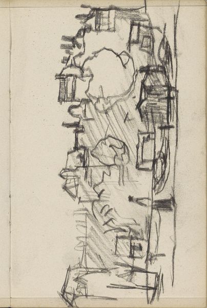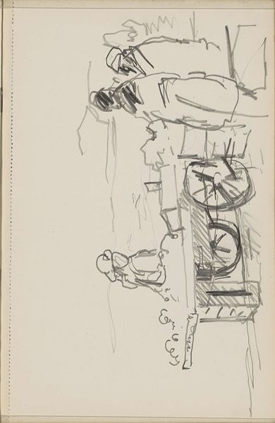 Curator: Good morning, let’s discuss this intriguing sketchbook page by George Hendrik Breitner titled "Cart Before a Building, Possibly a Barn," created between 1887 and 1889. Editor: My initial response is one of curiosity—the looseness of the sketch suggests immediacy and a fleeting moment captured. There is an intentional ambiguity here. Curator: Indeed, the very open handling, visible in the scribbled shading, and the rapid execution indicate the artwork's provisional nature, yet the structural forms, visible lines denoting spatial relations, adhere to rigorous, representational demands. We need to ask if we can relate that to Breitner's approach at the time. Editor: Absolutely. Breitner's process is central here, especially when considering this as a sketchbook piece. The labor involved is not just artistic creation, but of observing and recording a specific reality—what materials were at hand? What was the physical environment like when he produced the work? What social observations shaped the urgency to create a likeness, if it all? Curator: Those considerations inevitably tie into the aesthetic composition. For instance, note how the composition—while unfinished—nonetheless divides the picture plane into clear sections through a combination of bold and extremely light marks. Editor: True. Breitner makes no effort to idealize anything. His barn becomes something mundane to see at the edge of the urban sprawl. It's as if he uses the paper's material properties to convey the very provisionality of modern life in Amsterdam in those years, including its material poverty. Curator: That perspective aligns well with his artistic circle at the time. Even here in an apparent preparatory sketch, he emphasizes capturing a specific feeling or impression. Editor: Which is what makes the sketch so compelling. I keep coming back to how this isn't merely representational but actively explores what it meant to witness change during industrialization and growing consumerism—using the humblest tools available, a sketchbook, pencil, and ink. Curator: Considering Breitner's own words on art’s importance, to show “the atmosphere of the street,” even a sketch like this captures his core objective, both structurally and aesthetically. Editor: Precisely. Thank you; I find myself appreciating the interplay between intention and process on the page, bringing new understanding of daily realities embedded here.