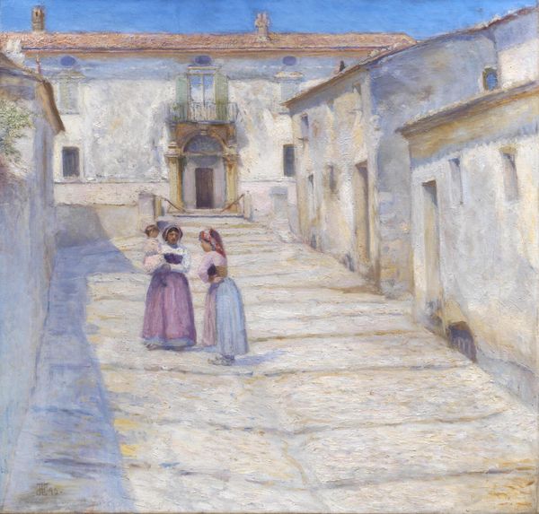 Curator: Neale Worley's oil painting, “Walking Home,” immediately gives the impression of a hot summer afternoon—quiet, still. Editor: I see a subtle commentary on the alienation of women in traditionally domestic spaces. Curator: Ah, I'm intrigued. While the scene may appear serene, notice the deliberate composition. The path directs the eye towards the house, and it terminates right at the back of the central figure; and yet, it simultaneously diverts, as a way for the solitary female to traverse a seemingly quiet exterior with its architectural backdrop. Editor: Precisely! The lone woman, perhaps returning from the market, is visually confined by both the structure of the road and the stone wall to the left, mirroring the actual social limitations imposed upon women within that Mediterranean context. Even her own shadow anticipates that arrival, and her turn into the cavernous building structure. Curator: The interplay of light and shadow enhances that feeling. Observe how the strong sunlight emphasizes the solid geometric shapes of the building. We must not forget that while “plein-air” seeks to translate the reality of being outside into paint, brushstrokes still give shape, and that choice will lend itself to meaning. The heavy contrast of lights to darks definitely plays on a heightened effect here. Editor: Indeed, and even more significantly, the shadows, cast diagonally across the lane, divide the pictorial space. The woman walks through an artificially constructed, and ultimately confined plane; such heavy use of darkness further accentuates her form. It subtly evokes her struggle. The use of her silhouette against the brighter architectural background—what’s being hidden and brought to the forefront becomes a crucial element to me. Curator: I can certainly appreciate that reading of social dynamics, but from the more formal elements, it seems that Worley's brushwork lends itself more so to a stylistic appreciation rather than one of critical identity. Editor: Well, I’d argue they are not mutually exclusive. The very materiality of the paint, those visible strokes, lends itself to revealing an engagement with the conditions of that reality and social location! Thank you for offering new ideas. Curator: And to you as well. Perhaps this artwork will reveal new ideas upon further contemplation.