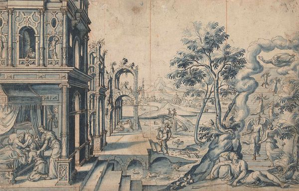 Editor: Here we have "Capriccio" - Landscape with Ruins, by an imitator of Francesco Guardi. It's a rather small watercolor work. I'm struck by how the architecture almost seems to dwarf the figures. What elements stand out to you? Curator: The interplay between the architectural structure and its inherent decomposition offers a compelling point of entry. Note how the artist uses line and wash to distinguish between solid forms and suggested decay. The ruins are not merely a backdrop, but are integral to the composition. Editor: So, it's about the contrast between the solid and the crumbling? Curator: Precisely. The use of linear perspective directs the eye, but the disrepair introduces an element of visual tension. Consider the columns, how they simultaneously define space and hint at its impermanence. Editor: I see what you mean. It's all about how the artist plays with these elements to create a certain effect. Curator: Indeed. The effect is one of deliberate construction and deconstruction, a negotiation between order and chaos within the pictorial space.
