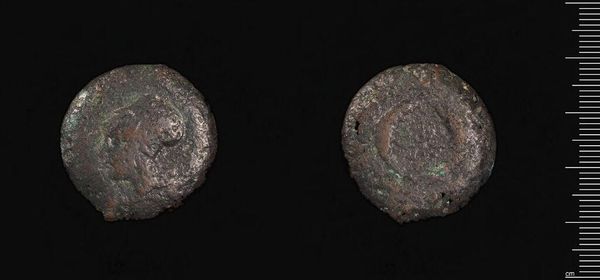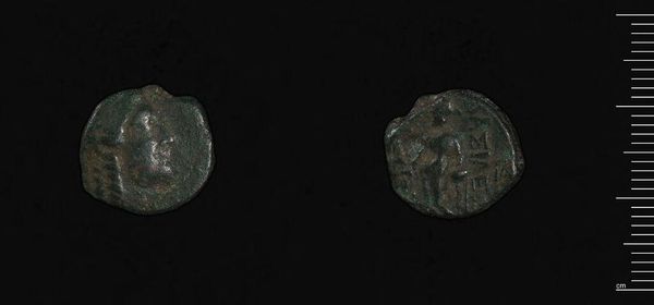 Curator: Here we have a Pentanummium, a small bronze coin, likely issued during the reign of Justinian I in Constantinople. Look closely at the imagery. Editor: There's such a melancholic feeling to it. The decay and wear speak volumes about the passage of time and lost empires. It’s fascinating how an object so small can evoke such profound emotions. Curator: Indeed. The markings, though faded, are rich in symbolism. We see the emperor's monogram and likely other religious or imperial symbols. These were potent visual cues of power and faith. Editor: But also consider who handled this coin, the socioeconomic factors. What did it mean to the working classes of Constantinople to possess this coin? It connects us to a specific economic reality. Curator: Absolutely. And the material itself, bronze, was chosen for its durability, intending to carry these messages far into the future. It’s a physical embodiment of cultural memory. Editor: It invites us to consider the power dynamics embedded within currency, and how these dynamics still resonate today. Curator: Seeing how the symbols persist despite such visible degradation really brings home the enduring nature of certain ideas. Editor: I'm left wondering about the hands it passed through and the stories this small coin could tell.