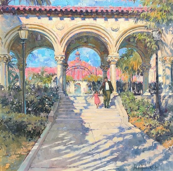 Curator: What strikes me first is the light—that shimmering Andalusian light that practically vibrates off the canvas. Editor: You're right, there's something about it that feels alive. This is José Garnelo’s "Patio De La Alhambra," an oil-on-canvas study that encapsulates the Alhambra's unique atmosphere. What can you tell us about the sociopolitical implications here? Curator: Well, you know, Alhambra represents layers of cultural shifts. The painting doesn’t necessarily focus on this dialogue and looks romantic more like capturing the serenity and architectural charm of a Moorish courtyard. For me, it embodies tranquility. The geometry of the garden, softened by the looseness of the brushstrokes and the shimmering fountain. It’s as if he's trying to hold onto a fleeting moment of beauty. Editor: Yes, and that “fleeting moment” is itself steeped in colonial history, the capture of Granada marking the end of Muslim rule in Spain. Garnelo’s decision to represent the Alhambra in this period cannot be apolitical. Are you persuaded? Curator: Hmm, perhaps you're right. It could be a re-claiming of history. Forgetting its troubled background for aesthetic appeal seems rather easy if you disregard the underlying narrative. Yet still...I return to the fountain, doesn’t it remind you of water speaking? Its ceaseless flow echoing down centuries. What is your opinion on that? Editor: Yes, absolutely the fountain, which itself functions in visual shorthand for ideas of cleansing, and of cultural and spiritual renewal – it reminds me about its presence in different places throughout history. It brings forth thoughts of ongoing, shifting dialogues about national identity. But Garnelo’s framing emphasizes the architecture of imperial conquest… Curator: Fascinating perspective. I might still say, I am quite fixated on capturing ephemeral light on water. Editor: Ultimately, it provokes a dialogue. Curator: Exactly! A dance between seeing, feeling, and understanding.