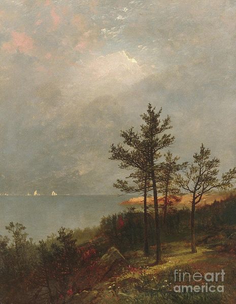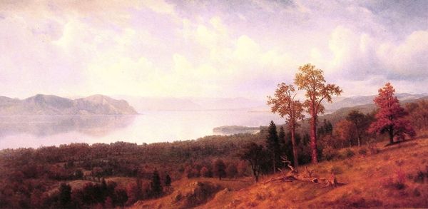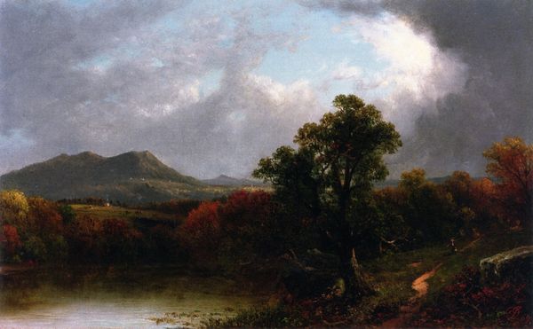 Editor: William Hart's "Spring Day on the Hudson," done with oil paint, presents a serene landscape. I'm immediately drawn to the texture, that impasto feel makes the foreground so tactile. How can we interpret this artwork, considering its medium and subject? Curator: Given its materials and subject, it’s crucial to investigate the Hudson River School's context. These weren't just landscapes; they were assertions of American identity, tied to the burgeoning industries of the time. How does this depiction of 'nature' possibly gloss over resource extraction, for instance, or the displacement of indigenous communities facilitated by the very waterways celebrated? Editor: So, the "serene landscape" isn't so simple then? Could the way Hart applies the paint, those deliberate strokes, suggest a tension between romantic idealism and the realities of industrial development? Curator: Precisely. Think about where Hart sources his pigments, brushes, and canvas. It all circles back to global trade networks and, arguably, colonial enterprises. Even his 'plein-air' approach necessitated specific tools and resources, allowing for this idealized view to be commodified. Does understanding this affect your initial reading? Editor: Definitely. It makes me wonder if Hart was consciously addressing these issues or if his art unwittingly became part of the narrative of progress, ignoring the cost. Curator: That’s precisely the question that situating the material production of the painting provokes. Thinking through such relations enables a crucial questioning of national myths through artistic practice. Editor: Thanks. I’ll never look at a landscape the same way again. Curator: Nor should you. Materiality matters.
