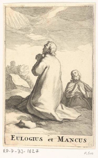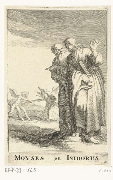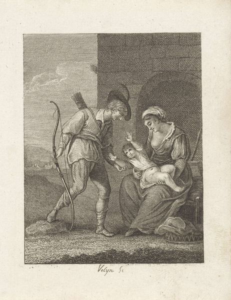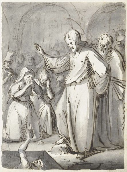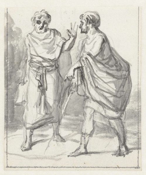 Curator: Welcome. We're standing before Moses ter Borch’s “Christ and the Samaritan Woman at the Well," a drawing made with ink on paper around 1661-1662. Editor: This piece has a quiet drama to it. The gray washes give it an ethereal feel, almost dreamlike, yet there's a striking tension in the figures' gestures. Curator: The subject, drawn from the Gospel of John, carries a deep symbolic weight. The well, of course, has always represented life, sustenance, and even revelation. Water as transformation, and the figures presented under starkly rendered conditions—the natural barriers as both symbolic and material obstacles. Editor: Right, and the figures themselves embody those opposing forces, their interactions shaped by the norms and transgressions that underpin it all. The Samaritan woman is rendered carefully carrying the means to draw the crucial well water; consider too her place outside the assumed narrative structures of that place and time. The iconographic strength of water as rebirth, as change, is incredibly pronounced here, given that placement of a non-believer. The artist has made very conscious decisions that give way to potent meanings here. Curator: Consider too that Moses ter Borch, working within a baroque idiom, harnesses the interplay of light and shadow to accentuate the narrative. Note how the use of contrasting monochrome values defines the figures' forms, accentuating the key visual components. These simple contrasts effectively create an emotive intensity, emphasizing the pivotal nature of their encounter at the well. Editor: That formal balance echoes the thematic balance: two worlds converging around a shared resource. And as an emblem of social barriers breaking down—the water transcends both literal and metaphorical thirsts. It’s hard to separate how, in this piece, the characters are so defined by each other: each aspect heightened by this visual dialectic, their gestures reflecting internal transformations. Curator: Yes, precisely; the work masterfully captures this critical juncture, the transformative conversation between Christ and the Samaritan woman. Looking closely at how form, composition, and tonal values contribute to its symbolic depth makes this a profound example of ter Borch’s artistic skill. Editor: Looking at this work gives new insight into the power dynamics and transformations conveyed, even through the subtleties of ink on paper. An extremely insightful encounter rendered deftly.