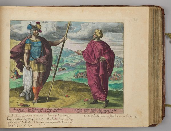 Curator: This hand-colored engraving is titled "Othniel and Ehud," created by Hans Collaert the Elder. It resides here at the Harvard Art Museums. Editor: It strikes me immediately as a bit theatrical, almost like figures on a stage. The colors are bold, yet there's a certain stiffness in the poses. Curator: Collaert draws from biblical narratives, depicting these figures as leaders and judges. Consider the historical context of religious art and its didactic role. Editor: But I also see the potential for interpreting these figures through a postcolonial lens, analyzing the power dynamics inherent in their portrayals. Who are they meant to represent and who is omitted? Curator: Absolutely, that tension between the representation of power and the lived experiences of those affected is important to consider. The visual culture reinforces certain ideologies. Editor: Right, and reflecting on these works critically allows us to challenge those ideologies and uplift the marginalized voices. Curator: It’s crucial that we explore art's complex relationship with society. Editor: Agreed. Let's keep digging.