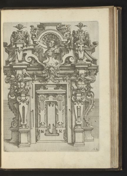 Curator: Immediately, the eye struggles to find a place to rest in this visual cacophony. Editor: Indeed! Let’s unravel this complex drawing. This is "Gelede wand met poortvormige muurdecoratie en pilasters met rustica, decoratie van rolwerk, een mascaron en een cartouche," created between 1593 and 1595 by Wendel Dietterlin. The medium is pen and ink on paper. Curator: Right, it’s almost aggressively ornate. The architectural elements are fighting for space. The Northern Renaissance loved this sort of thing, didn't they? The more complex, the better. Do you see it as I do, where it's so overwrought it begins to almost hint at some kind of cultural anxiety? Editor: Precisely. Consider the pilasters with rustication: the rough, unfinished stonework evoking antiquity but also strength. It’s a foundation on which all that rollicking, scrolling ornamentation is placed. The juxtaposition becomes meaningful— a statement of grounding historical influence struggling to bear the weight of fanciful artifice. Curator: And the mascaron! A grotesque face, meant to ward off evil spirits, but here it just adds to the overwhelming visual noise. Is it a protective symbol gone berserk? This page pulses with layers upon layers. I wonder if this relates to larger issues around social protection during this time of exploration. Editor: Perhaps, and then note how it's situated in the page—deliberately foreshortened, slightly cramped, as if squeezed onto the paper, confined to fit within the book. Curator: Good eye. That restriction impacts the experience. We aren't invited into the scene. Rather, the effect mirrors psychological claustrophobia – anxieties about place, space, and meaning that the symbolism exacerbates. Editor: It's fascinating to witness these symbols clashing within this relatively contained and aged framework. Dietterlin really seems to capture the tensions within the late Renaissance itself. Curator: A tense time in art, captured through the bold flourishes of ink. There is certainly something special on display with this study.