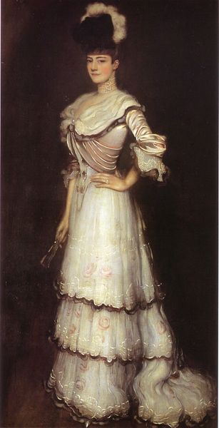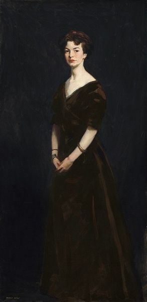 Curator: Immediately, I see an odd mirroring – or a very bold sartorial statement. Editor: Precisely! Let's take a closer look at this work. It's John Singer Sargent's portrait of *Mrs. Robert Harrison*, painted in 1886. Note the artist's characteristic flourish and capture of socialite elegance. Curator: Yes, "elegance" tempered by a distinct air of… theatricality, maybe even confinement. The dress bisected into stark halves evokes dualities, both visually and psychologically. The red is passion, blood, perhaps, clashing with the pristine white of… innocence? Editor: Fascinating interpretation! We can read these colours across history. One could also look at Sargent as a painter capturing the societal pressures on women, a tightrope walk between propriety and individuality. I'm sure she was just trying to make a statement! Curator: Or, on a grander symbolic scale, are those forces perhaps always warring? One cannot ignore the careful details which suggest this tension – that small delicate bracelet, and the light hands held clasped between one half and the other…It reads almost like an allegorical figure divided. Editor: Beautifully observed. Also look at Sargent's confident brushstrokes; they are both realistic and impressionistic at the same time. This adds another level of ambiguity and complexity to her expression. Does she enjoy being the subject? Or is this her fate and station? I feel compassion for this woman. Curator: An insightful question indeed! Are we looking at individuality celebrated or captured by social forces? Does the red stifle or liberate? These contrasts seem deliberately intended to invite reflection beyond simple beauty. The tension certainly creates lasting impressions. Editor: Perhaps it invites the question as to whether the truth may lie in paradoxes. We may be missing something altogether here; it feels we may need to embrace both to understand Mrs Harrison or perhaps understand ourselves a little better. Curator: Indeed, there remains a mysterious energy within it; something enduring that perhaps captures that dichotomy very effectively. Thank you, this gave me some things to consider regarding the symbolism.
