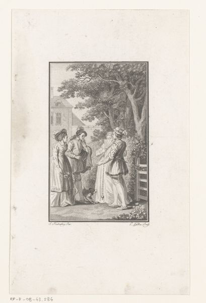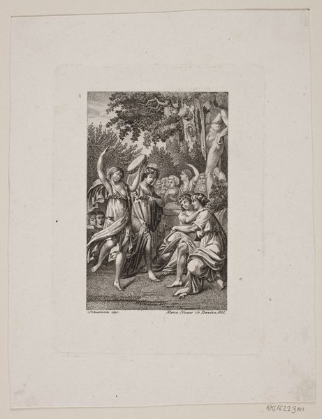 Carl Leberecht Crusius made this small etching called 'Men and women fleeing through a doorway' with ink on paper sometime in the late 18th century. The printmaking process is key to understanding this work. An etching begins with a metal plate, usually copper, coated in wax. The artist then scratches an image into the wax, exposing the metal underneath. The plate is submerged in acid, which bites into the exposed lines. The longer it soaks, the deeper the lines become. After removing the wax and inking the plate, it’s pressed onto paper, transferring the image. Think about the labor involved: the careful application of wax, the precise scratching of the image, the controlled use of acid. This wasn't just a quick sketch. Crusius invested time and skill, creating a matrix that could produce multiple impressions. The image could then be circulated and consumed. This little print embodies the complexities of production, skill, and social circulation in the 18th century, challenging any simple divide between art and craft.