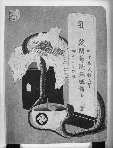 Editor: So, here we have Kubo Shunman’s "Soup Bowl for Suimono with Udo and Chopsticks on Wooden Tray, with Poem by Chirimendō from Kōfu." It’s this delicate little drawing... I’m struck by how intimate it feels, like a quiet moment captured. What do you see in it? Curator: It's funny you say intimate, because I agree. Shunman pulls us in, doesn’t he? It's a simple composition, but it's rich with suggestion. The poem dances above the bowl, almost like steam rising. And it makes you wonder, doesn't it, what story this meal is telling? A story of the seasons, maybe, a quiet meditation on taste and beauty? Editor: I hadn't thought about it like that, about the meal telling a story. It is so suggestive, all those implied textures, tastes… Curator: Yes! Art, like a good soup, nourishes in unexpected ways. Editor: Right. It makes me want to go home and draw my own dinner. Curator: And that, my friend, is the highest compliment we can pay to a work of art!