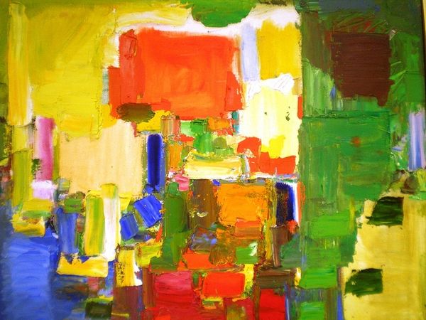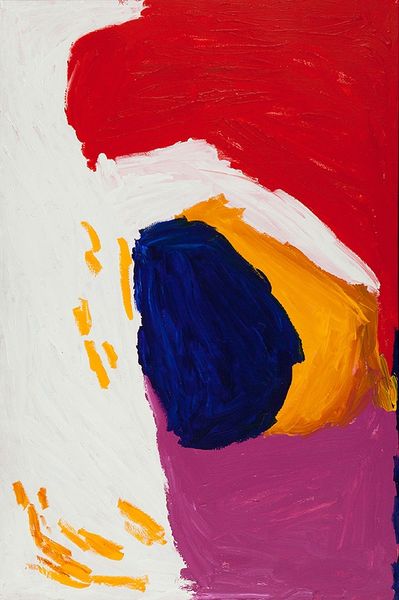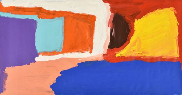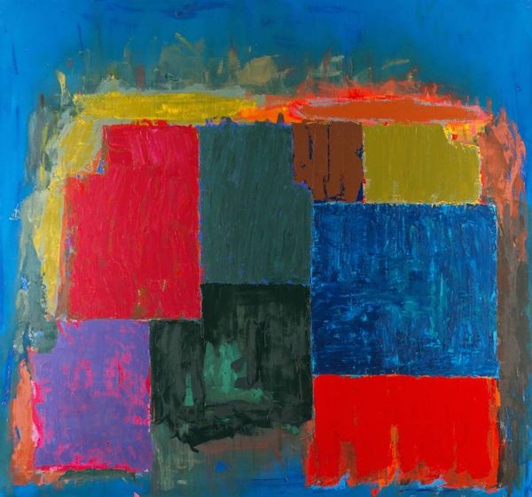 Editor: Here we have Hans Hofmann's "To Miz - Pax Vobiscum" from 1964, made with acrylic paint. What strikes me immediately is the raw energy of the colors and the geometric forms fighting for space on the canvas. How do you unpack something so… intense? Curator: Intense is a good word. I think Hofmann, bless his Fauvist soul, was after something beyond pure representation. To me, this piece is all about push and pull. Look at how he uses contrasting colours like the blues and reds—they're practically vibrating, right? He once said his goal was "to create relationships" which I find beautiful, relationships are made and felt so profoundly! Editor: Vibrating, definitely. And those solid blocks of colour... what’s with the squares? Curator: Aha! Those are Hofmann's signature. He called them “push and pull” or, more grandly, evidence of "spatial creation". The squares seem stable, but consider how he positions them, one against the other. It looks still, yet it’s ever so turbulent! Don't you find that dichotomy just a tad funny? I feel he must've seen that paradox! Editor: So it's about creating a kind of… visual argument? Curator: Precisely. Though an argument that seeks resolution, *Pax Vobiscum*, peace be with you. The painting seeks harmony amongst dissonance, a visual prayer, perhaps. And it’s just a flat surface in truth. What a strange irony, isn't it? Editor: It makes you think about how simplicity can contain complexity. Curator: And how colour and shape can whisper such evocative messages, don't you agree? And maybe, just maybe, it means even the seemingly simplest amongst us may have depths unseen, unrealized! A true delight if you ask me!