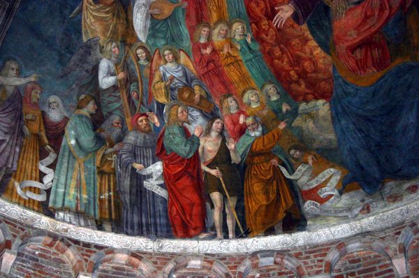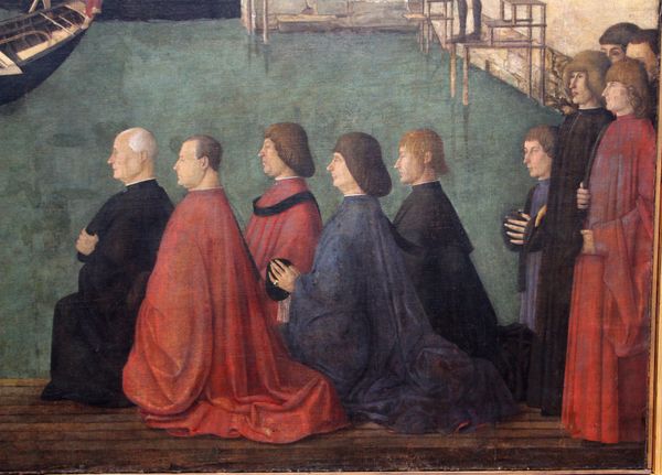 Curator: Looking at this teeming scene, I'm struck by the density and the relative coolness of the tones. So many figures! Editor: Yes, this detail comes from Gentile Bellini's painting, "Miracle of the Cross at the Bridge of San Lorenzo," created around 1500. Bellini, working in oil paint and possibly textiles, captures a specific moment, not just a general ambiance. It's so interesting that what may seem a crowded space to a viewer like you, presents in fact an image embedded with complex politics. Curator: I do see the narrative element now, but the crush of faces, the dark clothing punctuated by paler skin… it conveys a sense of both excitement and perhaps…oppression? I wonder, who exactly were these people, and what kind of statements they carry through the composition? Editor: The painting documents a real event. A relic of the true cross fell into the canal, and after several failed attempts, it was miraculously retrieved by Andrea Vendramin, the future Doge. Bellini paints it right at the intersection of Venetian public spectacle, religious belief and its impact on the state identity and legitimacy, where each of those elements reinforces the other. Curator: Ah, so this isn’t just about religious piety; it's a deliberate projection of power. The carefully rendered likenesses of Venetian society… it’s a who’s who of the era! They become symbolic of Venice itself. Who do you think has most visibility, who has power and access? What gender, what class, do they appear to have? Editor: Precisely. Notice how Bellini strategically places Vendramin, who knelt and successfully retrieved the relic in a privileged space. His act, highlighted, validates his family's claim to power but is not exempt of the complexities regarding, at the time, new families ascending. But the people there also matter. Who are they showing deference to? The cloth merchants? The priests? Notice their behaviors too. The very act of portraying the miracle becomes a potent endorsement of the Venetian social order and those seeking to maintain their positions within it. Curator: A cleverly staged drama, then, leveraging the language of religious awe to bolster the existing hierarchy. Looking at it now, I appreciate the layers of meaning woven into what I initially perceived as a somewhat chaotic crowd scene. Editor: It speaks volumes about how art can function not just as a mirror reflecting society, but as an active agent shaping its understanding of itself.