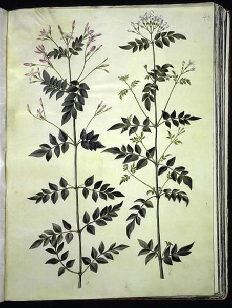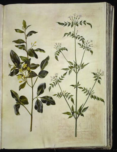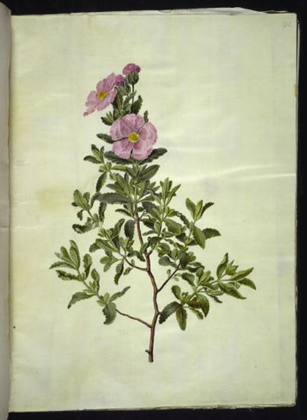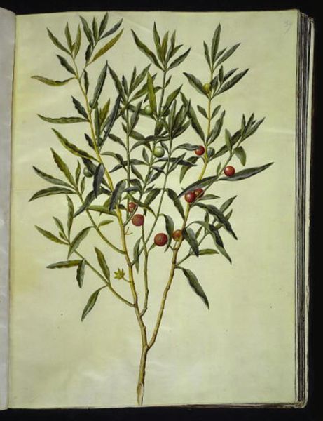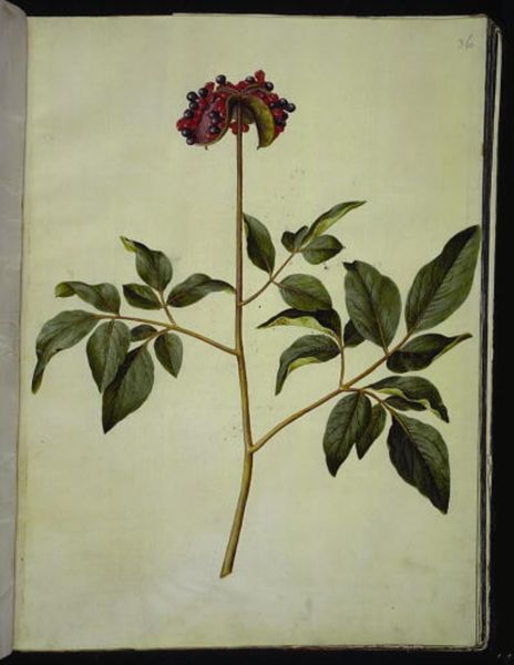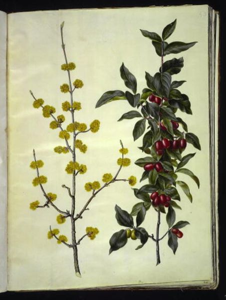 Editor: Here we have Hans Simon Holtzbecker's "Punica granatum (granatæble)", made sometime between 1649 and 1659, using watercolor and gouache. It’s a pretty straightforward depiction of a pomegranate plant, but there's something very deliberate about the arrangement of the different branches and fruit... How do you interpret this work? Curator: This image, meticulously rendered, transcends mere botanical illustration. Pomegranates throughout history have been potent symbols of fertility, abundance, and even immortality. Notice how Holtzbecker carefully details the fruit in various stages - budding, flowering, ripening. Editor: Yes, the different stages are striking! Do you think that choice might be intentional? Curator: Precisely. The pomegranate’s bursting seeds have long been associated with prosperity. Do you think it is about secular or religious beliefs? The choice to illustrate this plant at this time is not accidental; it taps into deep-seated cultural meanings. Perhaps a hope for a fruitful future. Editor: It hadn’t occurred to me, but now that you mention it, I suppose that fruit-bearing imagery might evoke very powerful sentiments… it makes me wonder what other “everyday” images carry symbolic weight. Curator: Exactly. Every element – the colour choices, the precise arrangements, contribute to an underlying narrative that speaks to our shared cultural memory and perhaps a personal yearning for renewal, painted during a politically unstable time in Europe. Editor: I see it so differently now. Thanks! Curator: It's these layers of symbolic association that give this image its enduring power.
