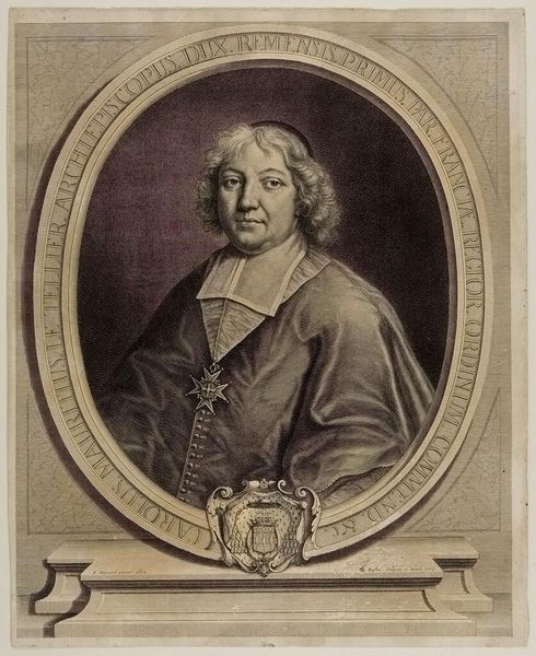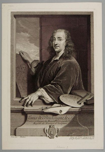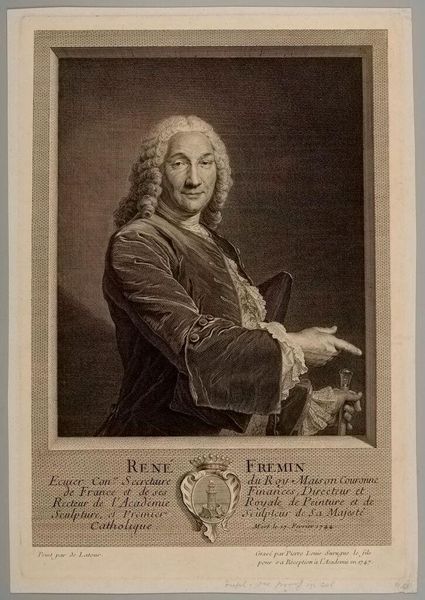 Curator: This is "René Fremin" by Pierre Louis Surugue, held at the Harvard Art Museums. The plate measures about 37 by 25 centimeters. Editor: It strikes me as formal yet intimate. The subject's gaze seems direct, but the monochrome palette lends it a somewhat distant, historical feel. Curator: Notice the subject's gesture, pointing outward. It's a classic rhetorical pose, used to direct attention, perhaps emphasizing authority or importance. Editor: Or perhaps it's a gesture of inclusion? Consider the context of portraiture in the 18th century, it was often a way to assert social standing, yet the gaze and gesture could also be read as an invitation to engage. Curator: The crest below also is significant. These symbols were carefully chosen, often conveying lineage, affiliation, or personal virtues. Editor: It's fascinating how such visual cues operate as signifiers of power and identity within specific social hierarchies. Looking at it today, I wonder how those codes are still at play, even unconsciously. Curator: Indeed, the resonance of symbols continues to shape our perception of the world around us. Editor: A poignant reminder of how much history is embedded in the images we encounter.