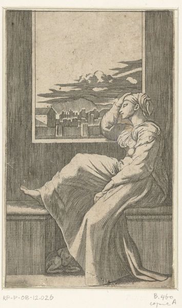 This anonymous engraving, "Vision of Helena," presents a composition divided between the earthly and the ethereal, rendered through precise, deliberate lines. Helena sits, seemingly in contemplation; her form is solid and weighty. Above, an angel floats within a framed vision, offering a cross that disrupts the architectural linearity of the city below. The artist uses line to create texture and depth, particularly in the drapery and the urban landscape. The engraving’s formal structure invites semiotic interpretation, where the cross carried by the angel acts as a powerful signifier of spiritual insight. The contrast between Helena’s grounded pose and the angel's weightless flight challenges fixed perspectives, suggesting a fluidity between the material and spiritual realms. Notice how the rigid lines defining the built environment below contrast with the softer, flowing lines of the angel’s robes. This juxtaposition is not merely decorative; it posits a dialogue between divine intervention and human construction. The engraving uses the formal arrangement of space and line to explore the negotiation between faith and earthly existence.