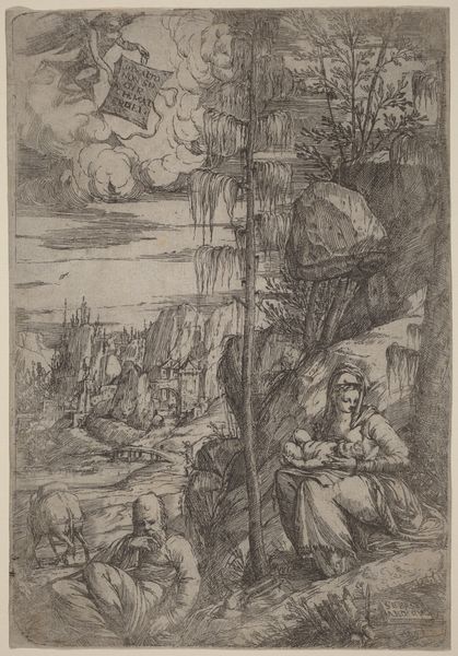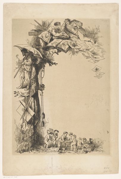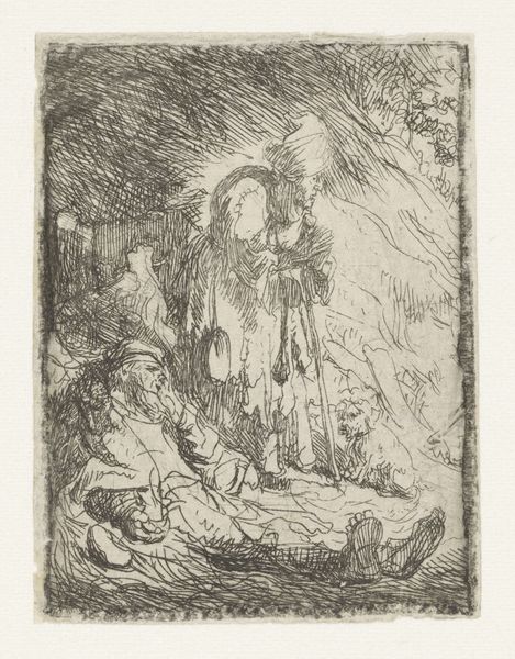Curator: Here we have "Noah letting the animals into the ark" by Giovanni Benedetto Castiglione, created between 1625 and 1635. It’s an etching, so a print made from an incised metal plate. Editor: It feels claustrophobic, almost panicked. Look at all those animals crammed together. The ark itself appears to loom, creating a really tangible sense of confinement. Curator: Yes, Castiglione really highlights the means of production. The dense, cross-hatched lines build up a rich tonal range despite the monochromatic medium. We see how labor intensive creating such detailed texture is. Consider too the materiality of the plate itself—the value in metal and how easily prints like this can be reproduced. Editor: Thinking about its cultural context, this scene speaks volumes about power dynamics. Noah’s power over these animals mirrors humanity’s relationship with the natural world, and perhaps a patriarchal order over different species, dictating who gets saved and who doesn't. This echoes themes of dominance found within religious and societal structures. Curator: It is interesting that you focus on the hierarchical theme when Castiglione's experimental techniques were so important to his practice. He was very innovative in inking and wiping techniques, often using a subtractive process, almost like drawing in light by removing ink, to make the scene dynamic. The blurred edges almost resemble a wash. Editor: True, and the lack of sharp lines gives the impression of movement and the impending chaos within that ark. One could draw parallels to the mass migrations and displacement of populations throughout history, which has clear resonances today. Curator: Absolutely, but for the 17th century viewer this print demonstrates how printmaking can provide multiple examples available for many owners. These images, relatively affordable, would have served a didactic purpose as well as satisfying collectors eager for more and more. Editor: Agreed. Considering that interplay—between artistic innovation and broader sociopolitical significance—certainly enriches our understanding of this complex image, doesn’t it? Curator: It certainly reveals a dialogue between method and metaphor. Editor: Indeed; between labor, animal rights, and representation.