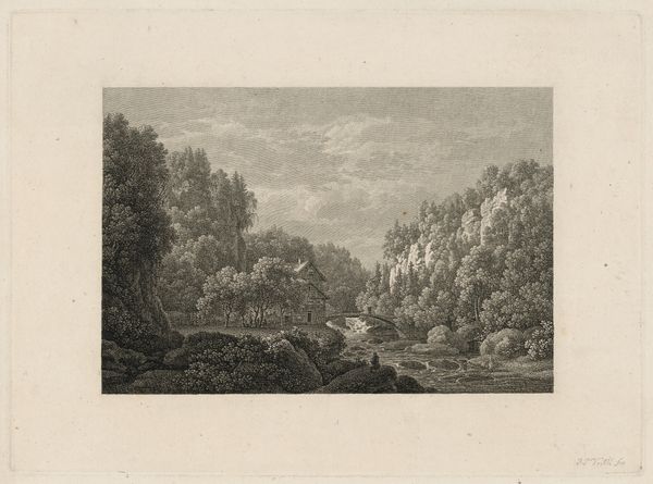 Editor: This is "Landschap met waterval," or "Landscape with Waterfall," by Dirk Jurriaan Sluyter, created sometime between 1864 and 1886. It’s an engraving, and it strikes me as having a real sense of drama. The water is so turbulent! What do you see in this piece? Curator: That churning water gets me every time! It’s almost like the artist captured the very heartbeat of the earth. But beyond the immediate impression, it's fascinating how Sluyter uses the precision of engraving to evoke the wildness of nature. He transforms the landscape into this romantic vision. Does the crispness of the engraving contrast with your idea of romanticism at all? Editor: That's a good point, I usually think of romanticism as big, sweeping brushstrokes, not fine lines. I guess it's romantic in its intensity rather than its looseness? Curator: Precisely! It's about feeling and drama, whether achieved through bold strokes or meticulously crafted detail. Imagine Sluyter, carefully etching each line, lost in the process of translating this raw, powerful scene. He isn’t just depicting a waterfall, he is trying to convey a sensation of awe and grandeur. A sense of the sublime, wouldn’t you say? Editor: Definitely, I get that. It makes you think about how much control the artist has versus how chaotic nature is. It seems like a real balancing act. I appreciate the insight! Curator: And I appreciate your perspective! Thinking about art as a conversation between control and chaos – that’s something I’ll carry with me. Maybe art, like nature, finds beauty in that tension.