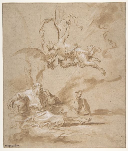 This is a sheet of sketches by Giovanni Battista Piranesi, made with pen and brown ink, over graphite on laid paper. Piranesi was an architect and a printmaker, and the materiality of paper and ink are central to his art. These were the raw materials for his visions. Note the artist's mastery over the pen, using line weights and hatching to create depth and volume. He deftly captures a figure in motion and hovering cherubs with just a few strokes. Drawing allowed him to explore imaginative possibilities, and to develop ideas that he would later translate into etchings or architectural designs. The layered, collaged appearance may be due to the economics of paper production at the time, when larger sheets were more expensive, so artists would often piece together smaller fragments. Piranesi's genius lay in his ability to bring these intangible visions into tangible form, using the humble materials of paper and ink as his tools. He blurs the boundary between drawing, design, and printmaking.