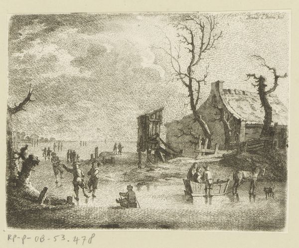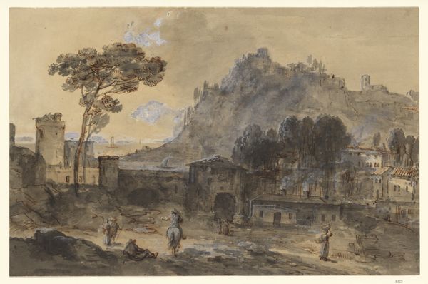 Editor: So, this watercolor drawing, "Ruïnes na de brand te Amstelveen, 1792," by Pieter Wagenaar II, captures what appears to be the aftermath of a devastating fire. There's such a stark contrast between the figures going about their lives and the utter destruction in the background. What story do you think Wagenaar is trying to tell here? Curator: Ah, a visual whisper from the past! For me, this isn't just about charred remains; it's about resilience sprouting from the ashes. See how Wagenaar uses that towering tree on the right, stark against the smoky sky? It's almost a symbol of life clinging on. And those ordinary people carrying their belongings, their faces unreadable, evoke a sense of quiet fortitude. Don't you think it begs the question: what makes a home? Bricks and mortar or the lives lived within? Editor: I hadn't considered that the people almost blend into the everyday even with this tragedy going on... they're strangely...composed? Curator: Exactly! There is definitely this inherent quality of the Dutch--very pragmatic and deeply aware of mortality in daily life. Are these people unaffected or simply survivors pushing through adversity, carrying their belongings and staying together to live on? It reminds me a little bit about our daily life struggles! Editor: Wow, that reframes everything I thought I knew about it. So, this is not merely a historical document; it's a meditation on humanity's ability to endure. Curator: Precisely! A reminder that even from utter destruction, life, in all its messy, complicated beauty, stubbornly finds a way to rebuild. Editor: That’s given me so much to think about. I'll definitely see this artwork in a new light now. Thanks!