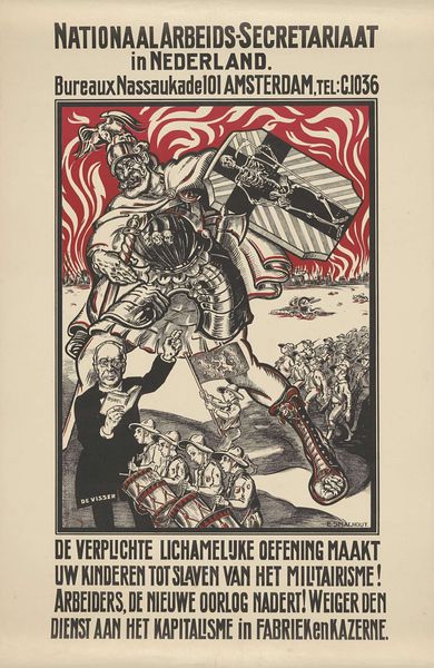 Curator: This ink drawing, "Alexei Tolstoy. The Adventures of Nevzorov, or IBIKUS", dates back to 1925. It seems to be cover art. The artist is Boris Kustodiev. The composition is striking. What do you make of it? Editor: Visually chaotic, isn't it? Yet there's a bizarre charm in the ordered mayhem, using what looks to me like layered sketches. The light and dark contrasts are stark; the medium must be well suited to high-contrast imagery. Curator: Kustodiev likely intended such layered depth. These graphic illustrations made for mass production reflect Russia’s shifting economic and political landscapes. Consider the printing press: the material foundation for circulating these images widely to shape public thought. Editor: Absolutely, it does command the eye, it guides your gaze from the running man at the lower left all the way up. I would also suggest paying attention to the clever deployment of geometric forms, with all sorts of connotations of course, given the circumstances. Curator: Geometry is also essential, providing structural strength and lending precision. What about the imagery itself: card-playing villain, the minarets...these illustrations served not only to capture the feel of Tolstoy's text, but shaped public discourse in the early Soviet era. Editor: Certainly! The stark juxtaposition of images—minarets and battle scenes, playing cards and chaos—evokes a world turned upside down. Curator: Precisely! Kustodiev expertly employs symbolism, but he is also making pointed statements about cultural clashes. And of course, that affects labor for poster production itself. Editor: On closer inspection, I notice a constant interplay between linear and textural elements, generating tension and an intriguing sense of motion throughout the work. Kustodiev directs us along the action as if we are a witness. Curator: Indeed, his visual rhetoric underscores historical turbulence as it captures early 20th century Russia grappling with profound transitions, doesn’t it? The medium became inseparable from messaging, I believe. Editor: I agree, seeing how expertly those messages and the text come through only reinforces how lasting the artwork is overall. It goes beyond what is being promoted.
