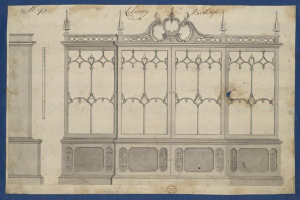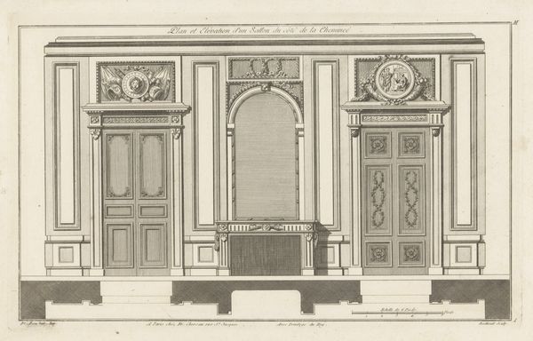 Curator: Here we have a glimpse into the 18th century with Thomas Lightoler’s "Design for the Decoration of the Window Door Wall of a Rococo Room with a Coved Ceiling and Coved Central Fanlight (Section)." It's thought to have been created between 1730 and 1770, a moment brimming with this kind of architectural aspiration. Editor: My first impression is that it looks surprisingly modern, or maybe prescient. Like an architect daydreaming of a very elegant dollhouse. It's almost aggressively symmetrical. Curator: Exactly. The Rococo was all about taking the ordered world and then bedazzling it, transforming the mundane into something fanciful. And symmetry? Key to presenting control and order through balanced aesthetics. The windows are flanked by ornament like elaborate trophies – winged figures, vines... the imagery bursts forth. Editor: Those eagle-like figures... what is their purpose? They look strangely heraldic and yet decorative all at once. Do they stand for something beyond mere aesthetics? Curator: That's the fascinating puzzle. The eagle in heraldry often represents power, sovereignty. By integrating that into domestic space, Lightoler might suggest aspirations for grandeur and status – domestic spaces that reflect self-governance and control within one’s own estate. Even the geometric line work underlying it all lends itself to that formal aspiration. Editor: I’m seeing the room's "face," or rather a theatrical stage. The central door has that little bust looking down –like a benevolent ruler judging how the play is going down. It's less a functional design, more a symbolic one. It really projects power and control over one’s personal realm. Curator: Lightoler almost sculpts the light in this composition. The coving of the ceiling creates this sensation that all of this grandeur is emerging, reaching into this heavenly space. Editor: Yes, the whole design seems caught in a perpetual state of becoming... The eagles seem ready to take flight; the room seems designed to impress... Perhaps, it also holds a universal human impulse: to not simply dwell but to impress, inspire awe. Curator: Lightoler gives us so much food for thought. The detail offers an intimate connection to the craftsmanship and worldview of the Rococo, so much more than mere décor. Editor: Right. A blueprint for power, played out within one's own walls. Fascinating how spaces truly shape and reveal what we truly want and cherish.