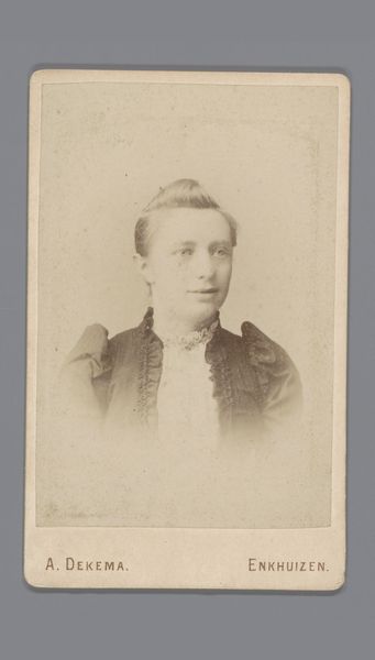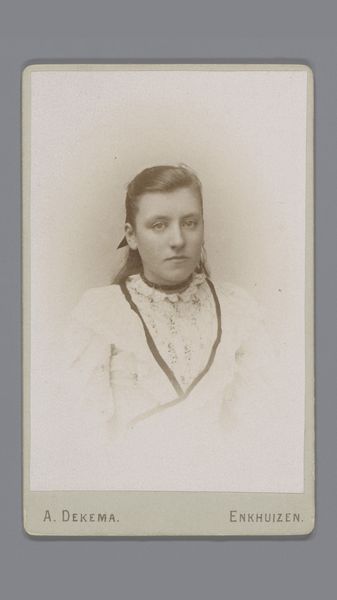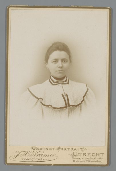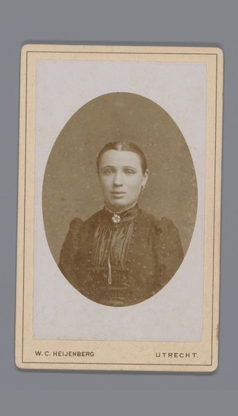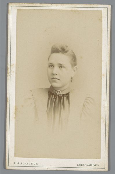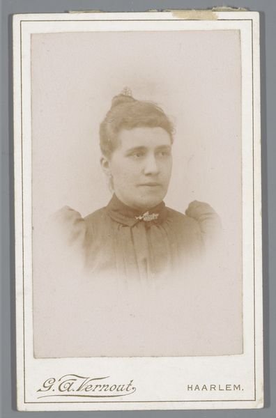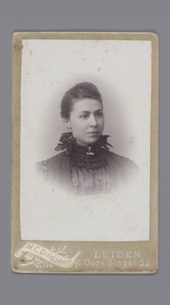 Editor: This is an early photograph, "Portret van een vrouw," placing it anywhere from 1882 to 1914. It's at the Rijksmuseum, but the artist isn't identified, which makes me wonder who she was and who made this photograph. Her gaze is very direct. What do you see in this piece? Curator: The averted gaze can say as much about a subject, even more at times, as a penetrating stare can. In this "Portret van een vrouw" it speaks volumes. There's a quiet resilience hinted at, don't you think? This visual language has to be contextualized, of course. The dark clothing, the simplicity of adornment -- do these elements speak to a specific social stratum of the time, or perhaps even suggest something about her inner world, her psychological landscape? Editor: I hadn't considered the clothing as symbolic, but the dark fabric does lend a certain severity. I initially read it as realism, simply documenting her appearance. But now, thinking about how the photo was composed, how everything seems muted... Curator: Precisely. Early portrait photography was a curated performance, even in its apparent realism. The light, the pose, and of course, the deliberate inclusion or exclusion of particular objects. Those all speak to a visual vocabulary that both reflects and shapes its culture. The absence of any bright, cheery signifiers seems particularly deliberate to me. This becomes even more suggestive, I believe, due to it not having a known creator. Editor: It’s amazing to consider the possible layers of symbolism beneath the surface of what I thought was a simple portrait. Curator: Absolutely. By recognizing how deeply intertwined images are with the cultural memory and psychological coding of a period, we unlock a richer understanding, don't you agree?