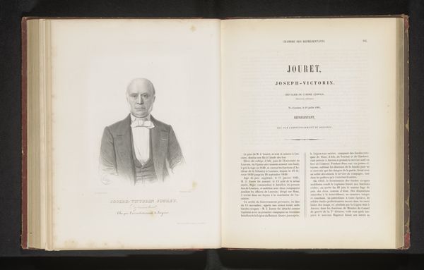 Editor: Here we have, open to two pages, a print of what appears to be a portrait of Jean-Baptiste Coomans. It's dated before 1858, and the whole thing is rendered in graphite on paper. It’s quite fascinating. What grabs your attention when you look at it? Curator: The dialectical tension created by the opposition of portrait and text. One cannot truly appreciate this work without deconstructing the structural interplay of the graphite image against the block of text. Observe how the linearity of the print contrasts with the aged texture of the paper. Editor: Right, the way the portrait's lines are so defined, compared to the weathering of the page itself is interesting. But how does that contrast contribute to its meaning, would you say? Curator: The meaning arises precisely from this structured opposition. It serves to accentuate the temporality inherent in the piece. The linearity alludes to precision while the aging references duration. They offer an implicit commentary on mortality and representation. Note how the photograph is presented within the book - itself a structural container with a beginning and end. Editor: I see, like the image is striving for a sort of permanence, but the aging paper undermines that? What does it mean to have that printed text alongside it? Curator: It adds a semiotic layer. Consider the text as a system of signs. It exists structurally parallel to the representational image. Editor: Wow. Okay, I definitely have a different appreciation for it now. It’s much more layered than I initially realized. Curator: Precisely. Visual language invites layered interpretations, each contingent on our formal analysis.