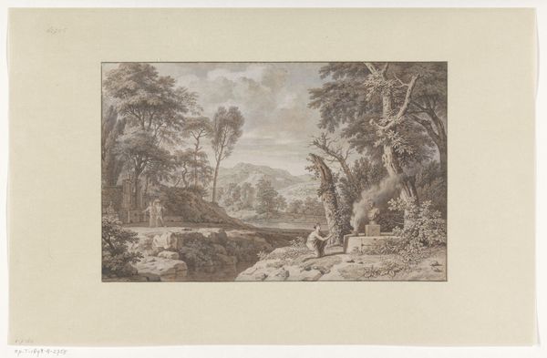 This fête galante, engraved by Jean Moyreau, presents a scene brimming with symbols of leisure and aristocratic delight. Dominating the landscape is the elaborate fountain, a motif reaching back to classical antiquity. The fountain and its surrounding garden grotto, adorned with sculptures, evoke the mythical landscapes of Arcadia, symbolizing a return to a simpler, more harmonious existence, an idealized vision of nature and pastoral life. This theme finds echoes in Renaissance paintings like Giorgione's "Sleeping Venus," where figures similarly inhabit a space of sensual repose. Note the swans gliding gracefully on the water. Swans, long associated with grace, purity, and love—symbols used even in antiquity. The image may conjure a collective memory of courtly love and romantic pursuits, connecting viewers to a shared cultural past. The gestures of the figures as they engage in music and conversation, invite us to partake in this idyllic vision, tapping into our longing for peace and beauty.