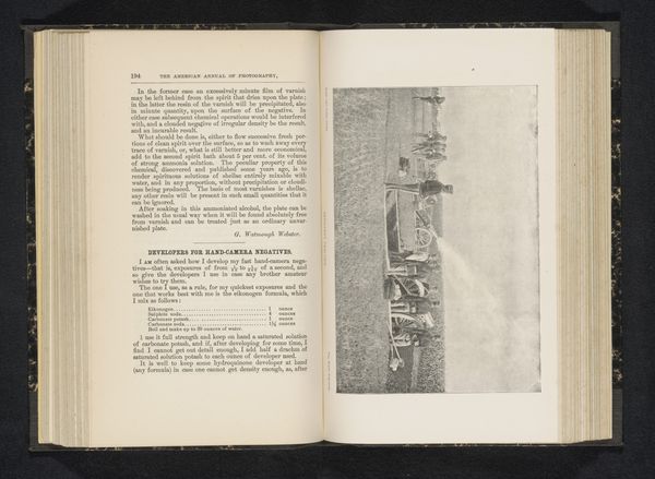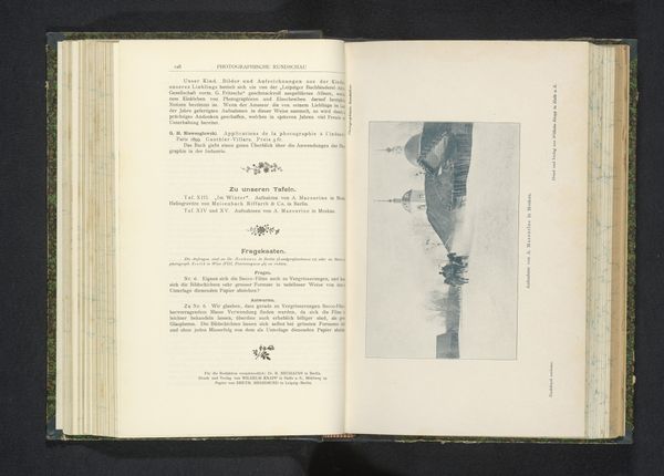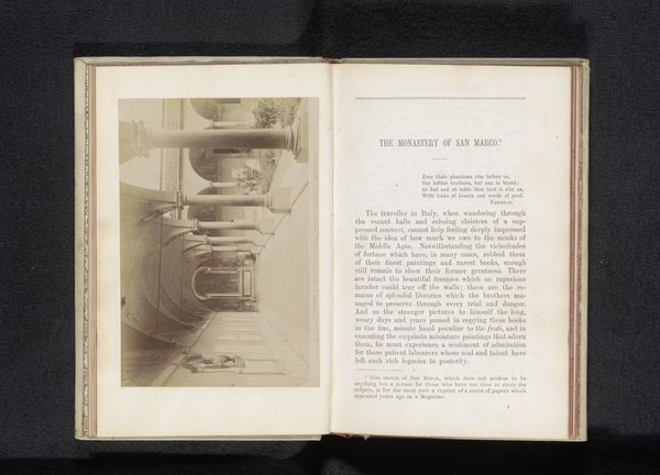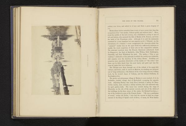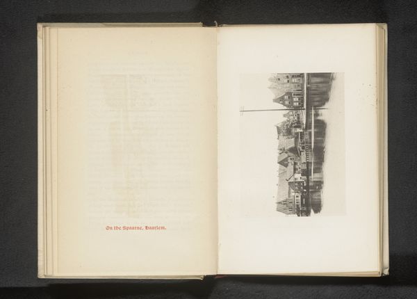 Editor: Here we have an image from before 1889 entitled "Gezicht op het eiland van Rousseau in Genève." It's presented as a photograph within a book, quite a fascinating layering of media. I'm immediately drawn to the stark contrast between the detailed architecture and its almost ethereal reflection in the water. What are your initial thoughts when looking at the composition and form of this piece? Curator: The starkness indeed compels close examination. What immediately strikes me is the insistent verticality— the bridge or structure ascends, mirrored, creating a play of positive and negative space that emphasizes linear precision. Consider the geometry: the rigid diagonals intersecting with the undulating, organic shapes of the water. This tension creates a dynamic visual field. Do you notice how the photograph’s limited tonal range— the greyscale—contributes to a sense of distance, a certain austerity? Editor: Yes, absolutely. It feels almost detached from reality, more like an architectural study than a scene of a city. The reflection especially adds to the sense of abstraction. So, you're drawn more to the formal elements— the lines, shapes, tones—rather than thinking about its subject or the potential meaning behind it? Curator: Precisely. We can contemplate the symbolic resonance of bridges, their representation of connection or transition, or perhaps, examine Geneva's architectural style from this period; however, my initial response resides in its intrinsic visual language, its carefully constructed composition and aesthetic materiality. Editor: That's helpful, viewing art purely through its composition makes its complexity a bit more understandable, especially when you're first encountering it. I'll try and adopt your vision while observing artworks. Curator: And I will endeavor to explore my impressions of its emotional qualities and the potential narratives that it evokes.