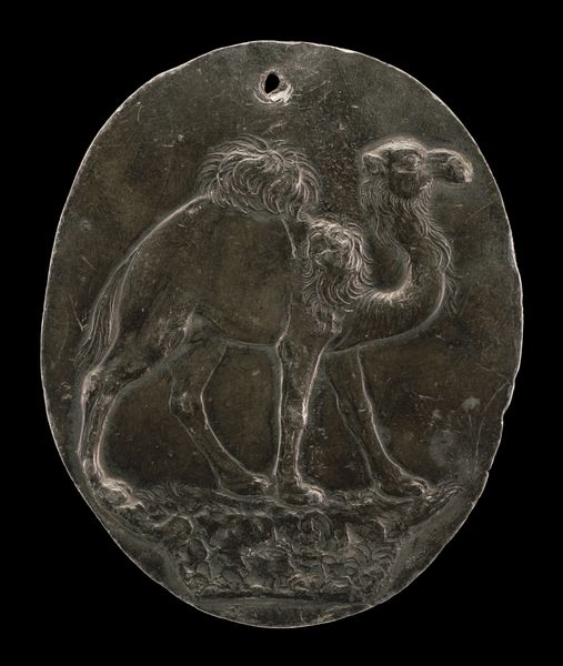 Editor: Here we have a bronze relief sculpture from after 1577 by Bernardo Rantwyck, titled "Griffin, Ducally Gorged, in a Landscape [reverse]". The circular shape and patinated bronze give it an ancient, almost talismanic quality. What stands out to you most when you look at this piece? Curator: For me, this piece is steeped in the visual language of power and privilege in the Renaissance. Consider the griffin, a hybrid creature, often associated with guardianship and strength. Its “ducal gorging” – wearing a ducal crown – speaks directly to aristocratic authority. How does Rantwyck use this imagery to engage with ideas of hierarchy and legitimacy in his time? Do you think there's perhaps an intent to legitimize power? Editor: I hadn’t thought about it that way. The landscape seems almost secondary to the griffin. Is the setting important in this context? Curator: Absolutely. The landscape grounds the griffin in a specific territory. We should ask ourselves, whose land is being symbolically claimed here? Renaissance art was often deeply entwined with political messaging. We must decode not just the mythological creature but also the context within which that image circulates. Consider its patronage: Who commissioned this, and what statement were they trying to make about their lineage or dominion? It appears to have a hole, so was it some sort of pendant or badge? Editor: So, understanding the political and social environment of the time is crucial to interpreting this image. Curator: Precisely. The artwork serves as a tangible artifact of a complex power dynamic. Understanding these forces at play really enriches the experience. Editor: It’s fascinating how a simple image can be such a potent statement about power and authority. Curator: Indeed. Analyzing it through the lens of history and politics allows us to engage with a deeper narrative and understand not just what it represents but why it matters.