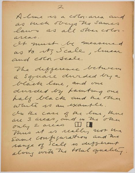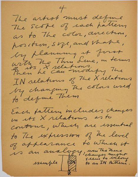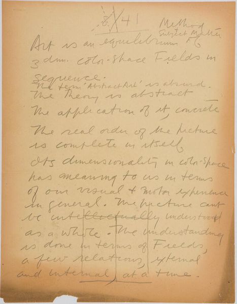 Curator: This is Stuart Davis's "Art Theory Text with Configuration Diagrams." It’s undated, but we know it was made in 1942. What strikes you about it? Editor: I find it interesting that it's not necessarily a painting, but rather a page filled with the artist's handwritten notes on color and form. What do you see in this piece? Curator: I’m drawn to the text itself. Davis is concerned with the material impact of color relationships and how these relationships generate meaning. He emphasizes the active construction of patterns through the juxtaposition of colors. How does this handwritten element affect your understanding of his work? Editor: It makes me think about the labor involved in artmaking, even the conceptual labor. I hadn't considered that. Curator: Exactly. It challenges the traditional idea of artistic genius. Editor: I see that now! Thanks for pointing that out.