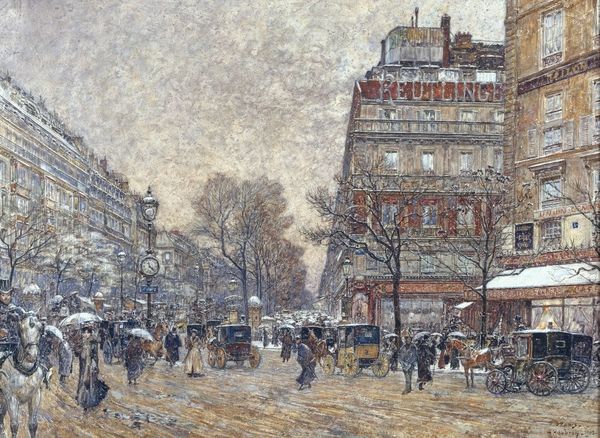 Carl Moll painted the Church of St. Charles in Vienna using oil on canvas. Here, paint is not just a medium for representation, but the very substance that conjures the scene. Look closely, and you'll see how Moll applies the paint in thick, deliberate strokes. These aren't blended seamlessly; instead, they retain their individual character, almost like the coarse threads of a woven tapestry. This physicality lends the painting a palpable texture, mirroring the rough, snow-dusted surfaces of the buildings and streets. Notice how the weight of the paint seems to mimic the heavy stillness of a winter's day. The artist applied techniques typically associated with craft traditions, where the hand of the maker is celebrated rather than concealed. The artist invites us to appreciate the tactile qualities of paint, elevating it beyond its representational function. In doing so, Moll blurs the boundaries between fine art and craft, reminding us that all art is, at its core, a product of skilled labor and material transformation.