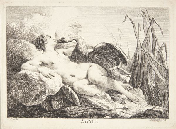 Curator: This print, entitled "Jupiter en Antiope," dates back to after 1615 and is currently held here at the Rijksmuseum. The work, realized in engraving, ink and paper, is attributed to Pieter van Sompel after van Dyck. Visually, what’s your immediate response to it? Editor: The atmosphere is undeniably heavy and sexually charged. The dark rendering of the trees seems to conspire to imprison Antiope on the ground while she is faced with the brute force of the God above her. The lines feel very assertive. It’s…imposing, visually and conceptually. Curator: Yes, that weight resonates with the historical context, doesn't it? Representations of mythological rapes were common. Yet they carry a distinct significance, reflecting and reinforcing existing power structures. Who had access and freedom of their own body. Van Sompel reproduces after van Dyck to speak about it. Editor: Absolutely, and beyond the dynamics of power, I'm struck by how this composition draws from a well-established visual vocabulary. Jupiter's eagle, for example, isn’t just a bird, it embodies imperial power and divine authority but most importantly male aggression and dominance. That link is so critical to understanding the work as a cultural artifact. Curator: Considering Antiope's positioning, too—nude, supine, vulnerable. She serves to represent the female body, specifically conceived for the satisfaction of patriarchal authority which in this instance are represented by male and God's physical and militaristic force. Editor: I notice how the drapes wrap around the character, but it doesn't manage to save Antiope's shame or sexual concession; or perhaps rather, her acceptance. I wonder whether there is a psychological element here in which she would see him as God himself. Curator: That element of presumed "consent" requires an analytical approach when understanding the imagery. I mean, we might decode and understand the relationship depicted on many levels, with one level perhaps revealing male God given authority above female earth giving subjects. Editor: I do wonder, looking at it now, about the degree to which it invites empathy versus voyeurism. The subject of this "sleeping beauty" here is questionable! But I recognize your approach encourages us to critique this paradigm that persists today in visual culture. Curator: Precisely. To examine it not as an isolated artistic creation, but as a component of a much broader conversation about power, representation, and the often-troubled history of gender dynamics. Editor: Thinking of Jupiter, this image has shifted my perceptions of the significance behind Zeus-Jupiter depiction and I can never consider the symbolic importance of birds in quite the same manner!