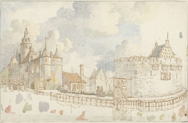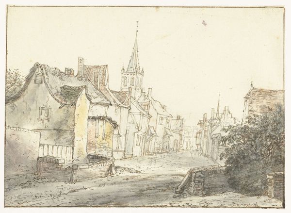 Editor: This is "View of Church Lane, Bristol" a watercolor and drawing created by James Johnson sometime in the 1820s or 1830s. It strikes me as quite simple, but pleasing – what are your first impressions? Curator: The architectural forms, delineated through watercolor and drawing, are particularly compelling. Note the repetition of gabled roofs and rectangular windows creating a rhythm across the composition. What visual cues draw your eye? Editor: I suppose the receding planes of the buildings, the way Johnson uses lighter washes in the background. What is the effect of that subdued palette, focusing mainly on earth tones? Curator: Observe how the artist articulates depth through subtle tonal shifts and the overlapping of shapes. This careful orchestration evokes a sense of spatial recession. This limited palette emphasizes shape and form. What compositional elements stand out regarding positive and negative space? Editor: The houses in the foreground dominate, but the hazy buildings in the distance almost disappear into the sky, making the scene look spacious. So, by focusing on structure, you are extracting meaning from the relationships within the composition itself? Curator: Precisely. By attending to the internal relations of line, form, and color, we gain insights into the artwork’s unique aesthetic language. How do these visual cues influence the viewers’ understanding? Editor: I see that Johnson's choice of colors, simple lines and layering give the picture its tranquil tone, and how all elements tie into the central idea of architecture as the focal point. It really focuses the gaze on shapes and tones. Curator: Indeed. A study in contrasts revealing depth, shape and form. Thank you for helping me think that through!