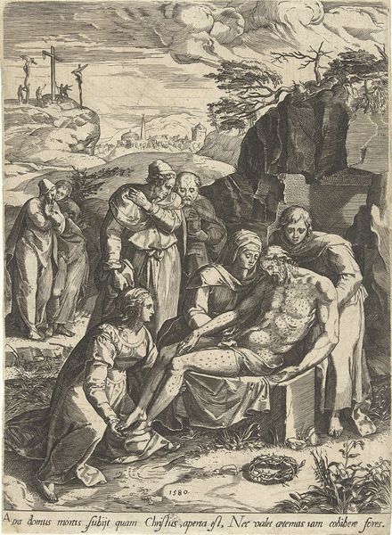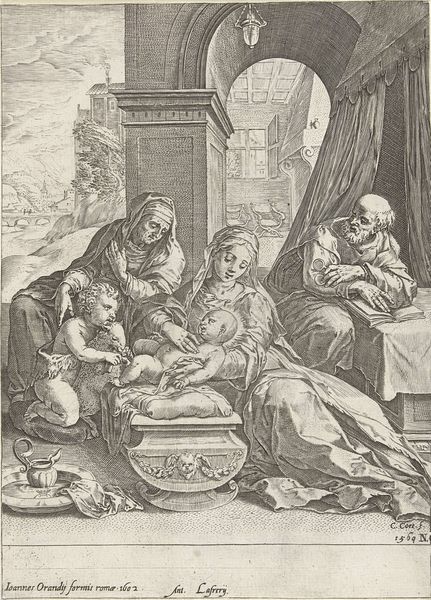 Curator: This print, titled "Heilige Familie met Elisabet en Johannes de Doper," or "The Holy Family with Elizabeth and John the Baptist," was created sometime between 1550 and 1625 by Pieter Jalhea Furnius. Editor: It's a scene imbued with a gentle melancholy. The intricate linework, all in tones of gray, seems to cradle the figures in a soft, contemplative mood. Curator: Yes, the scene depicts Mary, Joseph, Elizabeth, and the infants Jesus and John. Let's consider how images like this worked within Reformation era. The composition, dense with figures, would be recognized within religious teaching. Notice how the Christ-child is presented, and what that detail offers within cultural interpretations. Editor: I’m particularly drawn to the lamb nestled between Elizabeth and Jesus, a clear symbol of Christ’s sacrifice and innocence. And the cross that John carries...both serve as powerful indicators of the children's future destinies. Curator: It’s important to note the gender dynamics presented here. The central role of Mary and Elizabeth, and what is culturally acceptable is carefully presented through specific poses, which are representative of cultural norms related to devotion, love, and motherhood. The work then invites us to unpack the dynamics related to these socially sanctioned roles. Editor: Absolutely. Also, Joseph’s placement seems almost peripheral; physically present, but emotionally distant, gazing reflectively into the distance. This echoes, for me, broader societal attitudes around masculine participation within family structures, even within a divine context. Curator: That’s an interesting insight. These compositions provided frameworks for thinking about faith, morality, and, importantly, family structures, and were tied directly to class, race, and gender at that historical moment. Editor: Thinking about these relationships as expressions of power, how have the messages communicated been used within larger narratives to justify particular worldviews, or perhaps enforce gendered dynamics? Curator: Images such as these also invite us to critique our current assumptions regarding class and family structures. To further engage critically in our historical moment as well. Editor: So true! The work prompts reflections that reach beyond devotional practice to challenge the basis for family relations through different generations. Curator: Ultimately, the narratives continue to resonate and push beyond. Editor: Yes, as we allow the imagery to permeate beyond first glances.