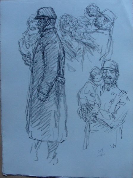 Curator: Today, we're looking at "Two Chatting Women with Two Children," a 1930 charcoal drawing by Käthe Kollwitz. Editor: Wow. It's raw, you know? Kind of unnerving. Those faces—especially the child holding the doll—they feel haunted. It’s almost as if she's seen too much. The sketchiness lends a sense of vulnerability. Curator: That raw quality is a hallmark of Kollwitz's work, deeply rooted in her socio-political consciousness and engagement with German Expressionism. As a pacifist and socialist, her art was often a voice for the working class and a response to the poverty and violence of her time. Note the figures' poses. Editor: Absolutely, that hunch in their posture—it speaks volumes. Makes me wonder what stories are woven into those postures, conversations, even glances—real heavy stuff, almost like a visual lament. Curator: Indeed. The artwork must also be interpreted in relation to Kollwitz's intersectional identities: woman, artist, socialist—identities that often placed her outside the mainstream. The intimacy in the scene also gestures at complex relationality. Kollwitz creates these worlds and also inserts herself into them. Editor: You can totally see it in the emotion radiating off the paper, in her unique way. I’m struck by the sense of interconnectedness she conveys. What do you suppose she was trying to capture—something about universal resilience or common human suffering? Curator: Kollwitz certainly aimed to highlight shared suffering and empathy. Remember that this piece was produced during the interwar period, marked by political and economic instability in Germany. Viewing this scene through the lens of feminist theory, one can recognize it as an exploration of women's burdened existence. Motherhood at that time had its own politics and conditions of duress. Editor: It's like she's trying to etch humanity's shadows in charcoal—its darkness and also glimmers of hope—right onto the paper. Thinking about how it reverberates today, it makes me pause and reflect on how universal this all is. Curator: Exactly. By connecting historical context to contemporary conversations around inequality, trauma, and resilience, the drawing invites us to contemplate and challenge the world around us. Editor: Yeah. When you give yourself to this image, let the stories and humanity connect with you…I guess this art piece keeps you thinking for a long time. Curator: And in that extended gaze and continuous contemplation, lies the lasting power of Kollwitz's art.