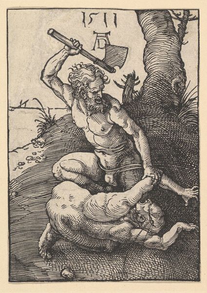 Curator: So, here we have "Hercules Fighting the Nemean Lion," an engraving made by Albrecht Altdorfer sometime between 1500 and 1538. Editor: Whoa, it's intense! Even in this tiny format, you can feel the struggle. There’s something almost claustrophobic about the way the figures fill the frame, all teeth and claws and straining muscles. Curator: Indeed. Altdorfer, known for his landscape work, employs incredibly dense lines here. Notice how he uses the engraving technique to create varied textures, distinguishing the hero’s skin from the lion’s fur and the rocky ground. It’s fascinating to see how he translates form into purely linear terms. Editor: And he's captured the ferocity perfectly. Hercules looks almost animalistic himself, mirroring the lion's aggression. It’s as if the act of battling such a creature transforms him. Did Altdorfer mean to convey some sort of blurring between man and beast? Curator: It's a possibility. The context is important. These prints were relatively accessible, meaning the tale of Hercules became a commodity in a sense. Altdorfer’s artistic labor translates into the broader dissemination of this mythological narrative. Also note Hercules’ weapon – the bow – laying unused, suggesting hand-to-hand struggle, maybe an echo of man's relationship to nature or its subjugation. Editor: Absolutely. Looking at it again, that bow and those unused arrows, that actually humanizes Hercules and makes me wonder, what does this small, intensely wrought piece say about our relationship to beasts we must fight or overcome? Even within ourselves, maybe. Curator: A great point. Altdorfer delivers the human and more material dimension, the heroic struggle. Editor: Yes, a brutal miniature world captured in lines. Definitely gives one pause.